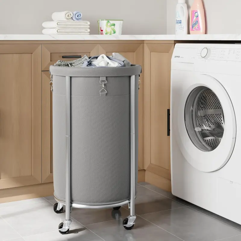 Easy to Move & Lock: The Round Laundry Cart is equipped with 4 smooth-rolling casters, including 2 locking wheels, allowing you to easily maneuver it to the laundry room and securely stabilize it during use. With its functional design, this laundry basket is ideal for organizing your life. It can be for storage in hotels, inns, laundry rooms dorms, and more, also suitable for families for daily laundry storage needs