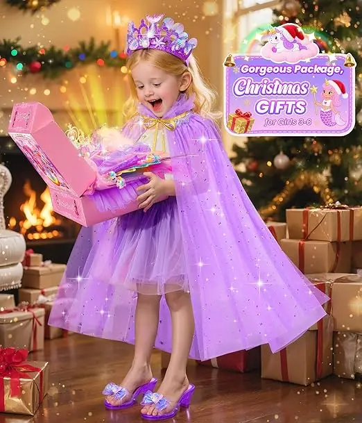 ·Magical Dress-Up Treasure Chest: We've curated every piece for a perfect head-to-toe role play, making it her very own boutique of dreams. 2 pairs of sparkly princess shoes, 1 fluffy princess tutu skirt,1 princess cape, 2 crown tiaras,1 wings, 1 crown, and jewelry sets—1 necklace, 1 earring, 1 rings 1 bracelet.from the glittering accents to the vibrant color schemes—makes her feel like she's stepped right into her favorite magical storybook!