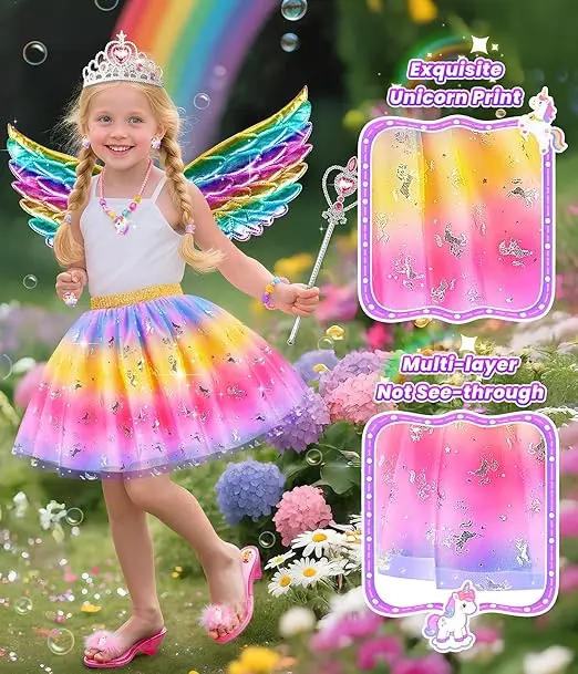 ·Unicorn & Mermaid Fantasties: She can spend one day as a unicorn and the next as an oceanic mermaid princess. The vibrant colors, magical designs, and complete accessory sets will fuel her imagination for hours.From the moment she holds the sparkling wand to the final twirl in her colorful tutu, she's not just playing—she's stepping into a story where she's the star. This is more than a costume,it's her first step into a world of grace, confidence
