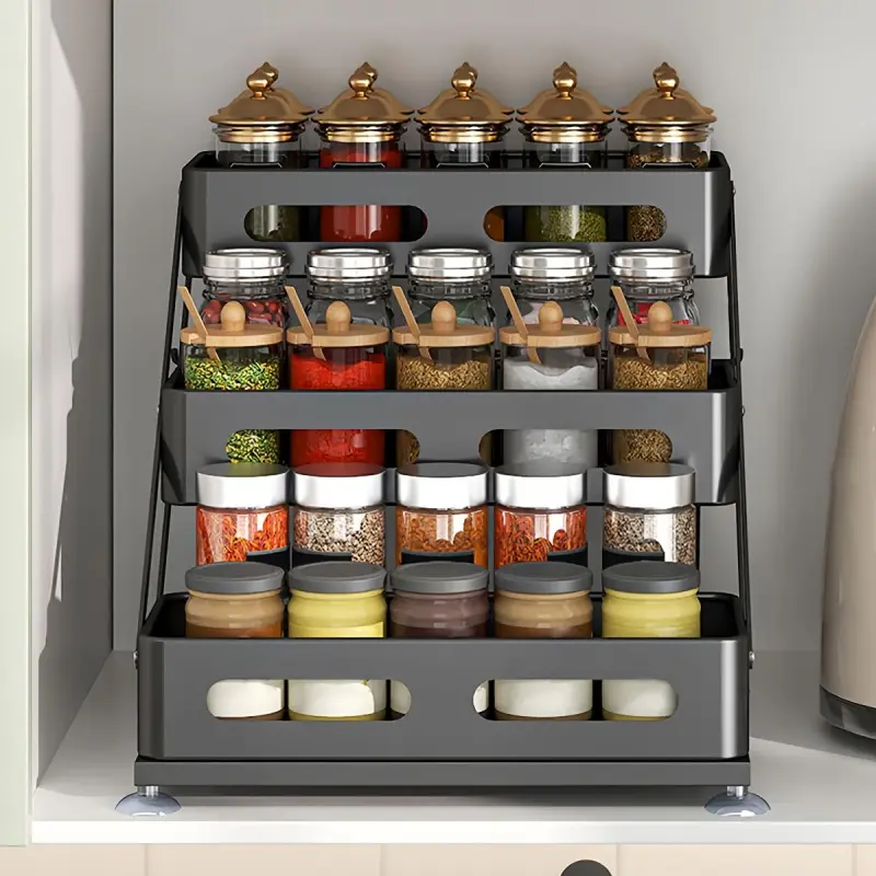 The 3-layer foldable cast iron spice rack is a household item that combines practicality and storage functions.Here is an introduction to its product description for you: