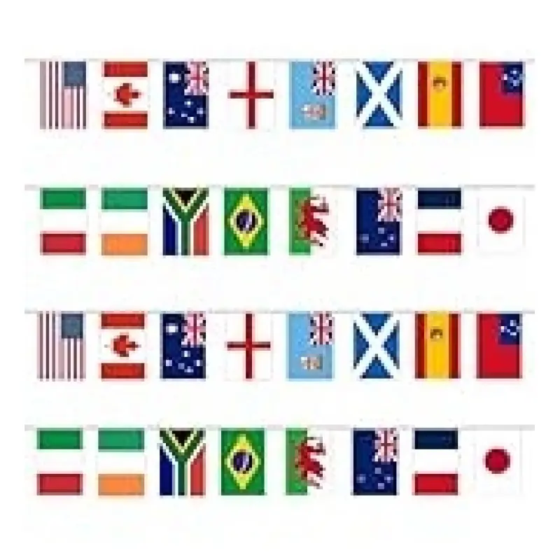 The handheld flags represent 16 countries, namely South Africa, Japan, the United Kingdom, France, Ireland, Italy, Scotland, Wales, Spain, Canada, the United States, Australia, Fiji, New Zealand, Samoa, and Brazil