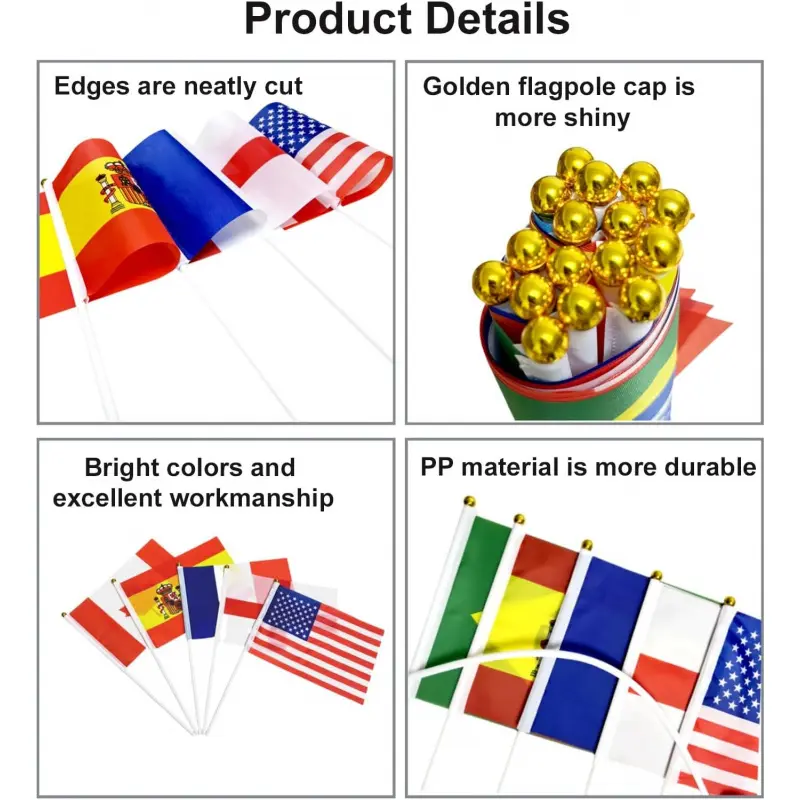 2. Our handheld flagpoles are made of high-quality polyester fabric, with bright colors, waterproof and fade-resistant properties, reinforced with double stitching, not prone to detachment, and can be reused for a long time