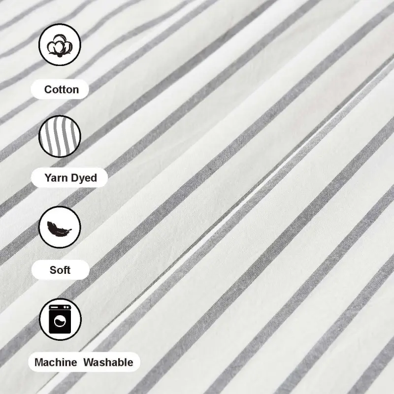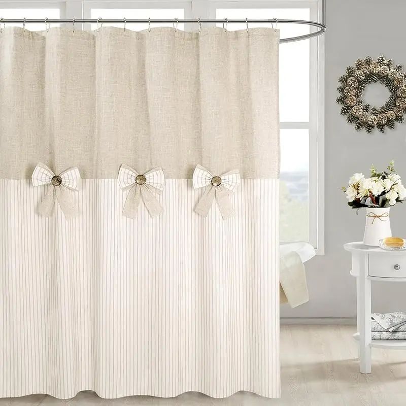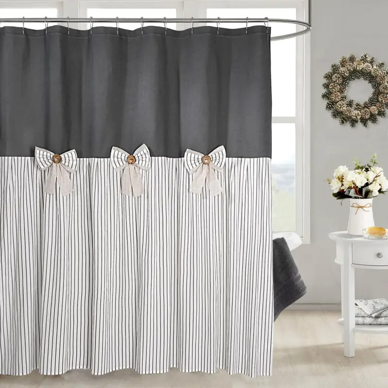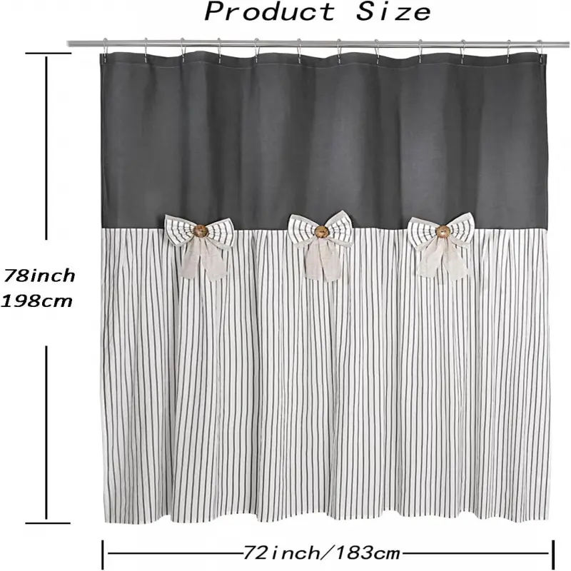 MEASURE--72 x 78 in, reinforced top header with 12 button holes for long-time using and easy installation with any ring or hook.Soft, cotton woven and cotton blend fabric curtain with a farm house,shabby chic or country style design for your bathroom.Black striped shower curtain with pleats and wooden button embellishments to enhance your space.Solid black and grey stripe in a yarn dyed weave, this ticking striped bow shower curtain features a farmhouse and country style that is complimentary to your bathroom décor.Two tone shower curtain with pleats and wooden button embellishments to enhance your space.Shower curtain with striped pattern works well with many decorating style: shabby chic, French country style, modern rustic, boho and country style.Machine wash in cold water with like colors,gentle cycle.Do not bleach.Tumble dry low,remove promptly.Iron if needed.