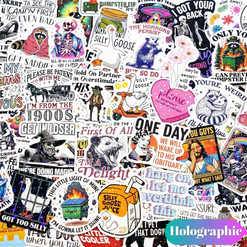 WARNING: These funny stickers are for adults only and not suitable for childrenFunny Stickers for Adults: This sticker pack contains 200 designs, for adults who enjoy quirky sayings, silly animals, sarcastic jokes, and everyday chaos. A fun and relatable way to express your vibeChaotic Variety, Maximum Personality: Ranging from relatable everyday struggles and sarcastic memes to edgy animal jokes and bold workplace quips, this sticker pack has something to match every mood and spark countless laughsRecommended Surfaces: Ideal for smooth surfaces, including laptops, water bottles, car bumpers, phones, Kindles, journals, computers, toolboxes, and more. These stickers adhere well and can be easily removed without leaving residueSize: Each sticker measures approximately 2 to 2. 6 inches on its longest side, making it for personalizing your belongings. Pre-cut for easy application - just peel and stickWaterproof Vinyl Material: Crafted from thick, premium holographic vinyl, these stickers are both waterproof and weather-resistant, designed to withstand daily use while maintaining their bold, vibrant colors