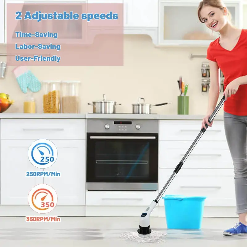 [2 Speeds & Detachable & Adjustable Mop]The Electric Spin Scrubber offers two different rotation speeds to tackle all cleaning tasks.Use the low 280 RPM speed for daily cleaning and to the high 360 RPM speed with a click for deep cleaning needs.The length is adjustable to prevent bending or climbing, effortlessly cleaning high places and hard-to-reach corners.