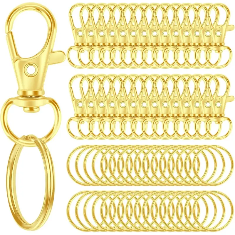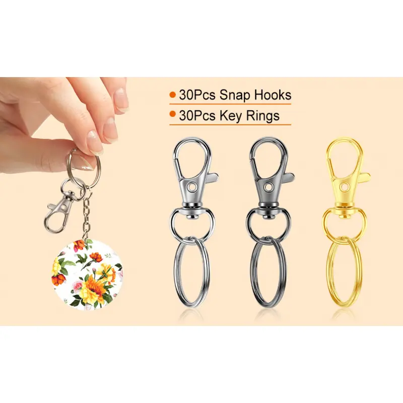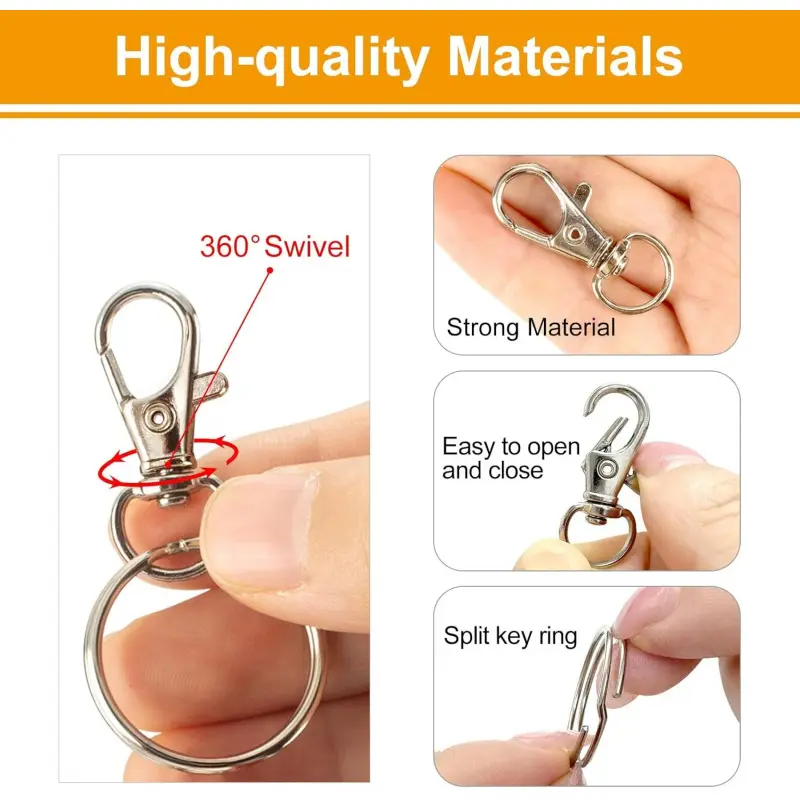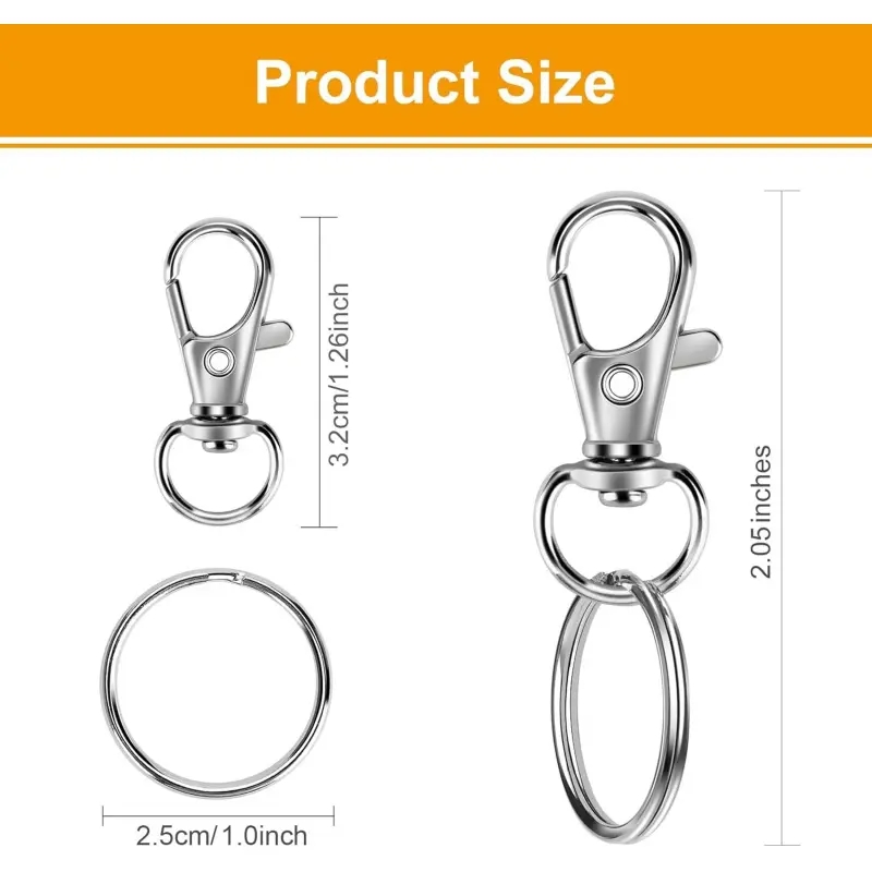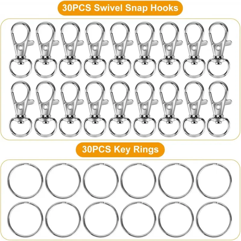 Package Quantity: 60PCS Keychain Making Kit includes 30 pieces Swivel Snap hooks and 30 pieces key rings, value for Keychain jewelry makingSize: The length of lobster claw clasp is 1. 26inches, ring inner diameter is 0. 4inches, the keychain rings are 1 inch in diameter. size to match your keychain projectsMaterials: The snap hooks and key rings are made of zinc alloy, smooth and durable, robust and long time for useSwivel Flexibility: The keychain clip hooks is designed with a clamp opening and 360 ° swivel flexibility, The metal snap hooks are a snap closing accessory to ensure your items will not fall offMultipurpose Usage: The lobster claw clasp and key rings are for make keychains, lanyards, handbag, purse, handbags and other small keychain projects
