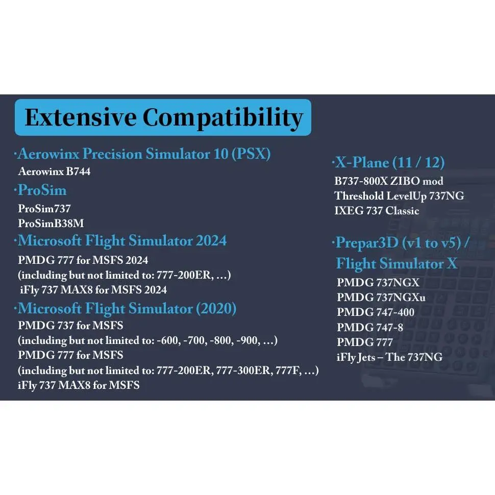 ·Wide Simulator Platform Compatibility Designed to work with mainstream PC-based flight simulation environments when properly configured, supporting advanced desktop and full home cockpit installations