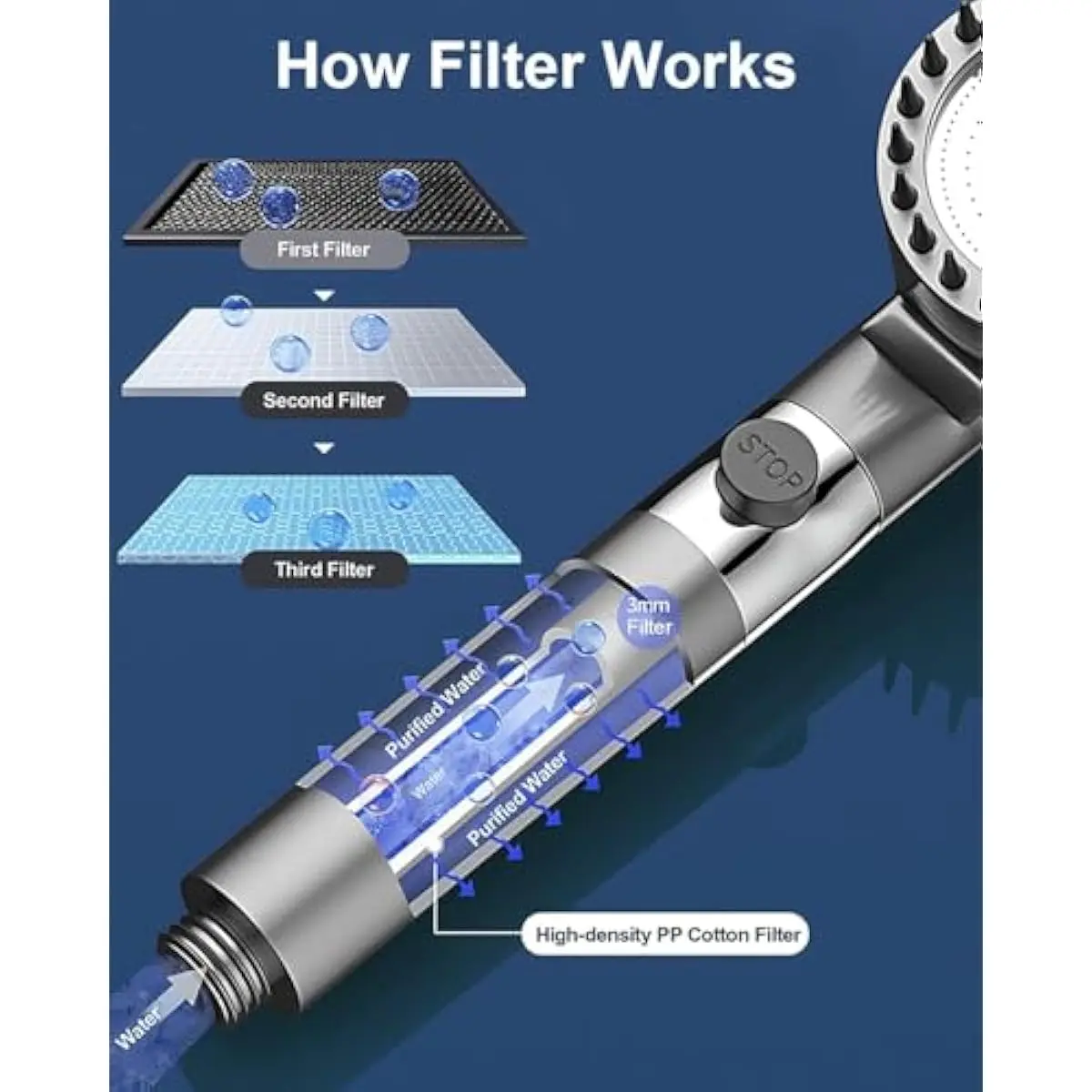 **BUILT-IN FILTER: Includes a filter system that helps reduce impurities in water for a cleaner showering experience