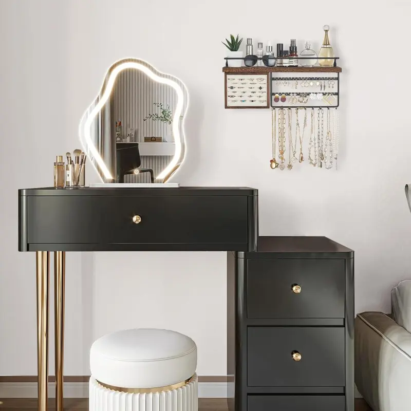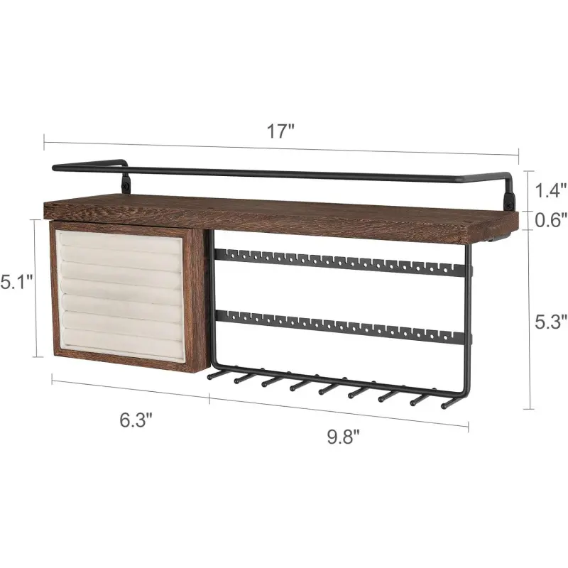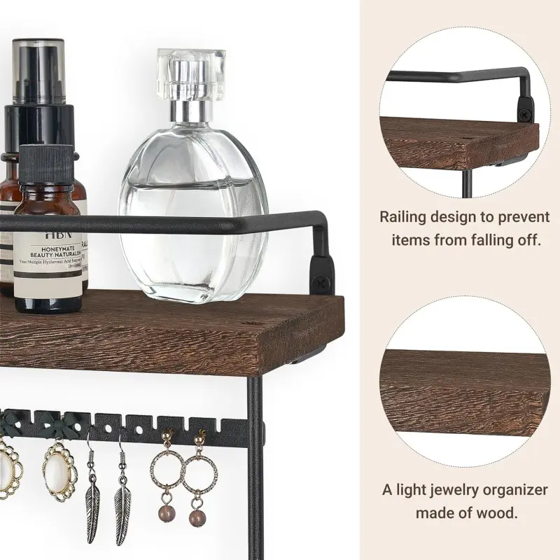 Rustic Jewelry Shelf organizer:The top display shelf of this hanging jewelry storage organizer provides additional space to place your cosmetics,skincare products,making use of wall space and freeing up the space of your dressing table.The railing design of the hanging shelf can prevent items from falling off.