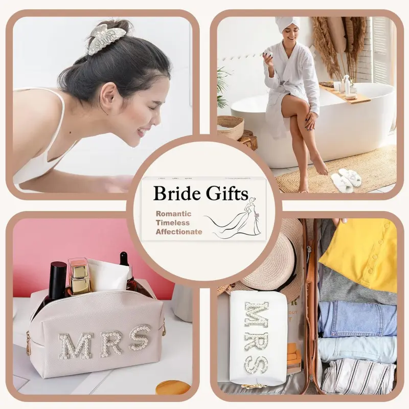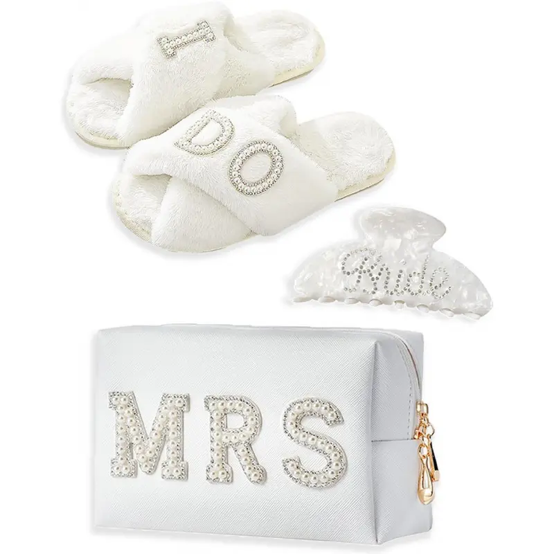 🎀Versatile & Romantic Bride Accessories for Her Special Moments🎀: This Mrs letter patch makeup bag, "I Do" slippers, and bride claw clip set is for all romantic occasions like engagement parties, honeymoons, weddings, bridal showers, and more!💍This romantic bride accessories combination will make her feel extra special, dazzling, and charming throughout her wedding journey and beyond!💃