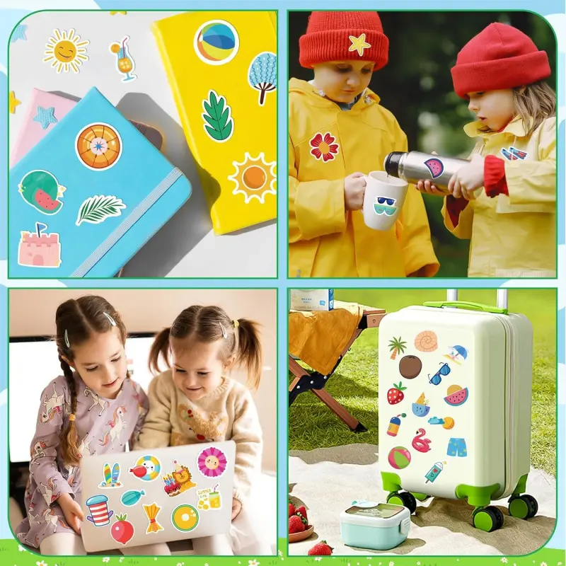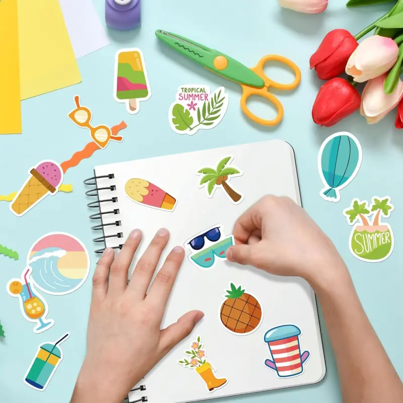 Our summer stickers are not just decorative items, but an essential part of your summer home decor.Made with a glossy film process, they offer a smooth and shiny effect.They are waterproof, sun-resistant, and scratch-resistant, suitable for both indoor and outdoor use.Whether you want to decorate a beach bag, a laptop, or a summer scrapbook, these repositionable stickers adhere firmly and look beautiful.Each pack of stickers weighs approximately 15 grams and is neatly packaged in an OPP bag, ready to add a touch of summer charm to your life.They also make excellent summer party gifts, adding a touch of summer magic to any celebration
