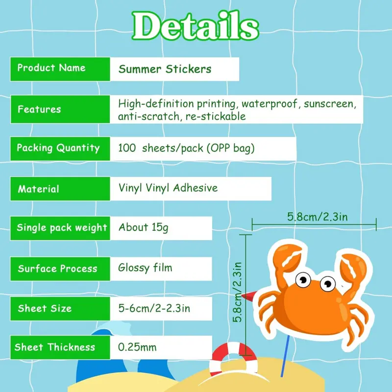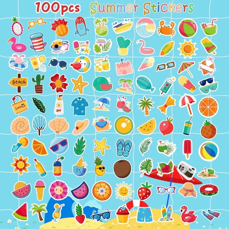 Get ready for a sunny summer!Our 100-piece summer sticker set is an absolute summer essential!Each sticker measures between 2-2.3 inches in size and is 0.25 millimeters thick, making it a delicate little work of art.These stickers are made of vinyl material, which is not only brightly colored but also durable.High-definition printing ensures that every summer-themed detail, from cute crabs to juicy watermelons, is clearly visible.These stickers are perfect for creating stunning summer decorations, whether it's for an ice cream party, to embellish summer items, or as decorations for a summer birthday party