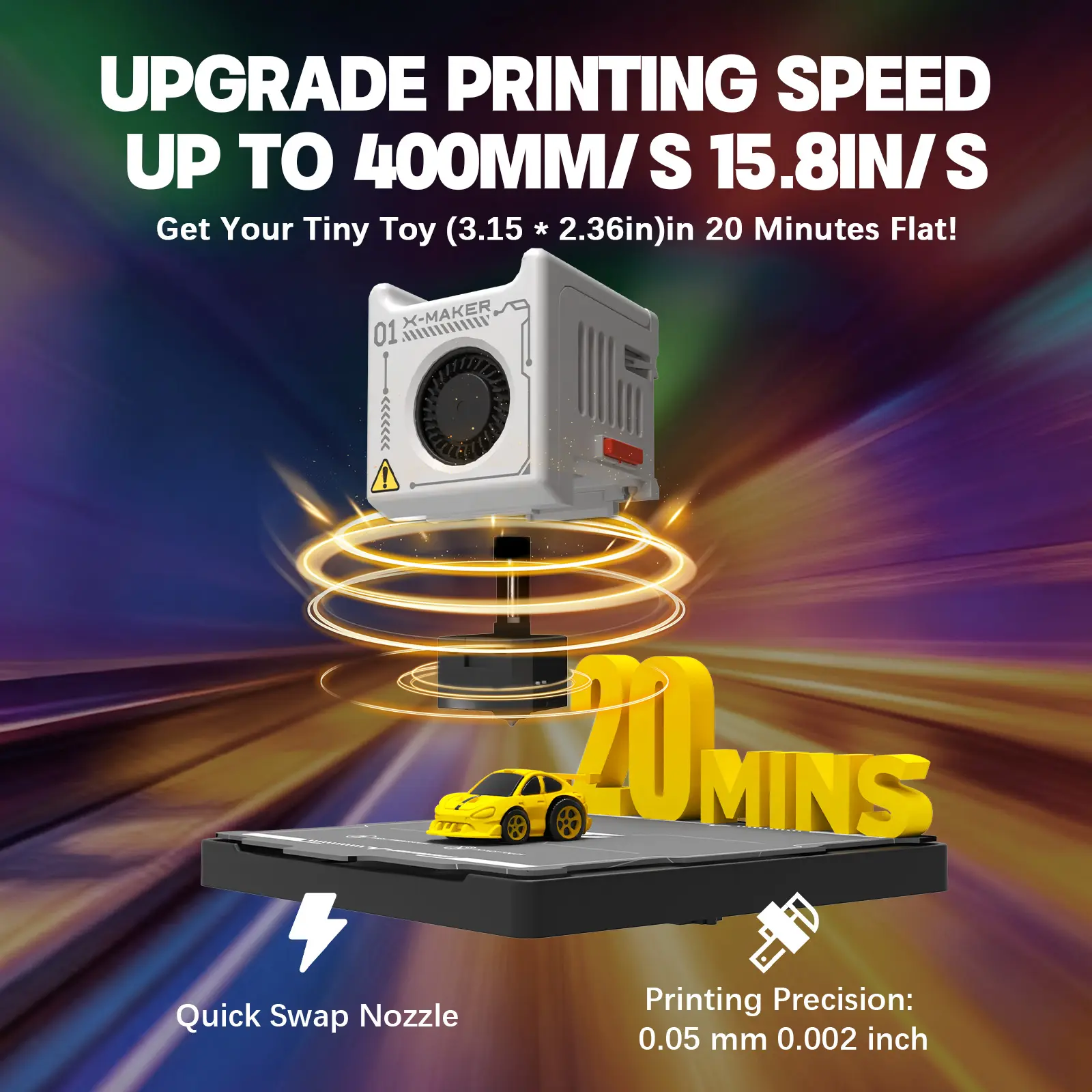 Prints up to 400mm/s with high precision. Small models can be completed in around 20 minutes, keeping kids engaged and excited.