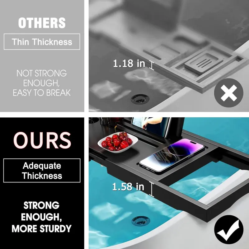 FOLDABLE, EXPANDABLE - This bathtub caddy was specifically designed to expand from 27.6 inches to 39.2 inches,fits all standard roman bathtub, you just need to manually adjust it to the right length and don't need any tools.The bath caddy tray for tub neatly folds in half, making it easy to carry around or store.You won’t have to struggle to find space after use, as it will conveniently slide into any available corner of your bathroom or linen closet.