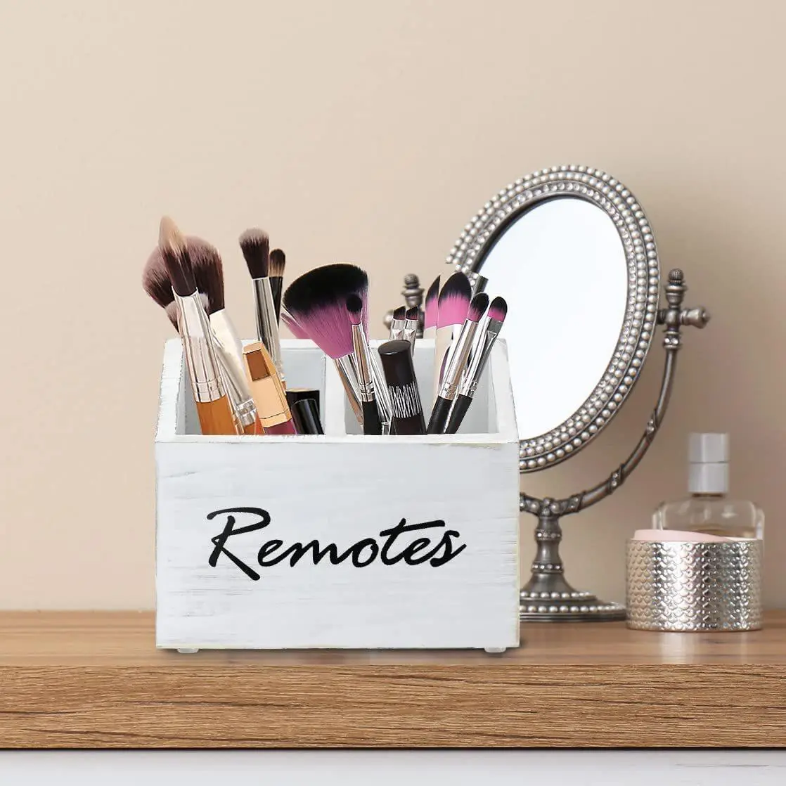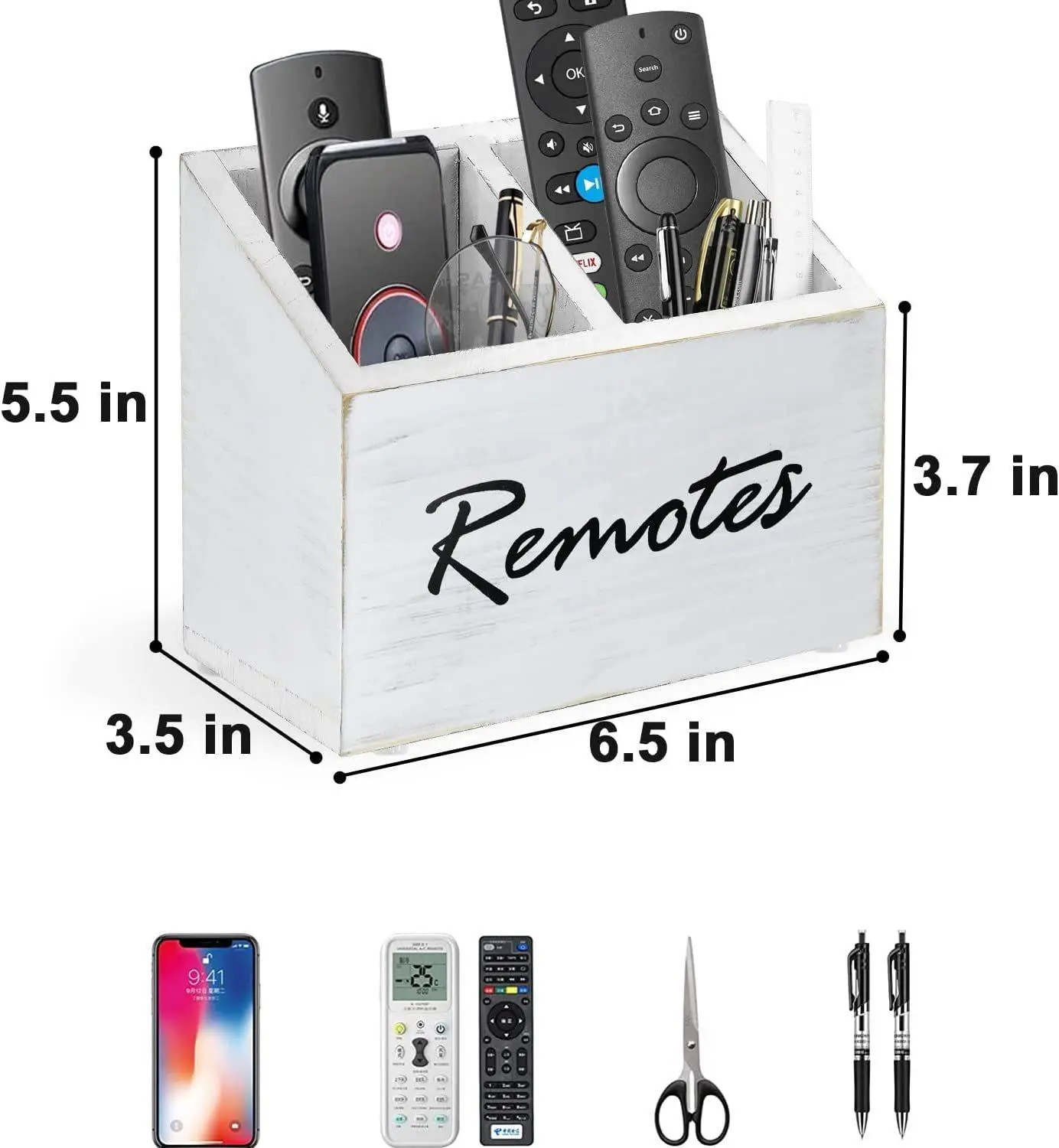 Remote Control Holder, Retro White TV Remote Holder, Remote Organizer Caddy for Table, Wooden Remote Box for Nightstand, Remote Caddy with 2 Slots storage
