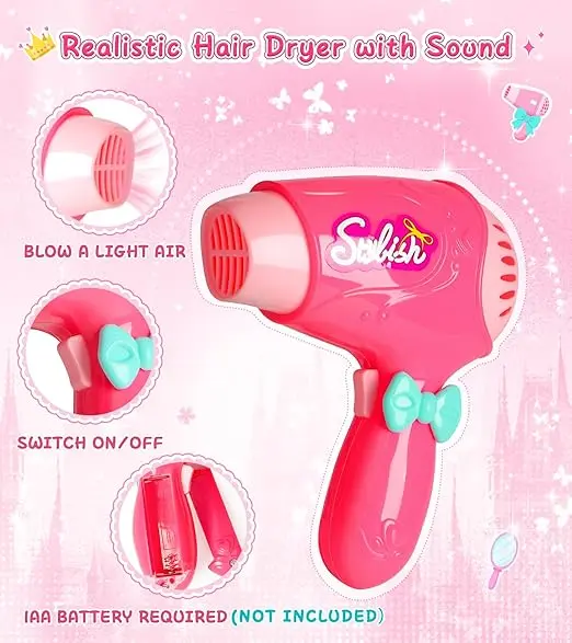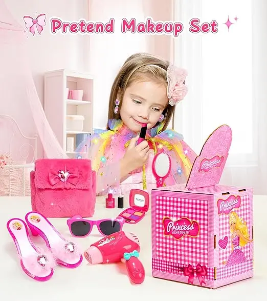 ·12 PCS Kids Makeup Kit: Including a set of fake make up kit, 1 hairdryer, 1 combs, 1 sunglass, 1 cape, 1 pink handbag, 1 earings, 1 pair of shoes, 1 mirror and a beautiful quality storage box. Snap the mirror into the lid to create a mini dressing table. Packaged like a luxury boutique set (no wrapping needed)