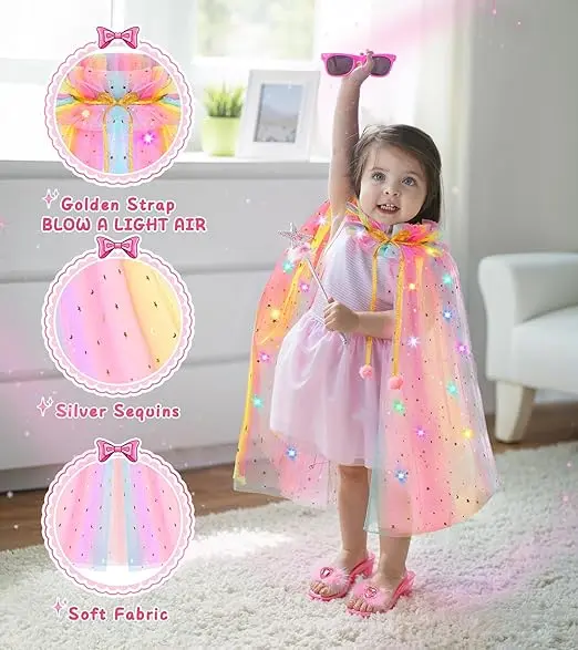 ·Magical Light-Up Princess Set: Cape made by soft and comfy mesh tulle fabric with two layers of sheer mesh, Matching princess shoes are made of ABS plastic decorated with dreamy fluff and heart-shaped crystals, make your little girl every step sparkles, every twirl shines. Glows day or night – perfect for parties, photos, playtime