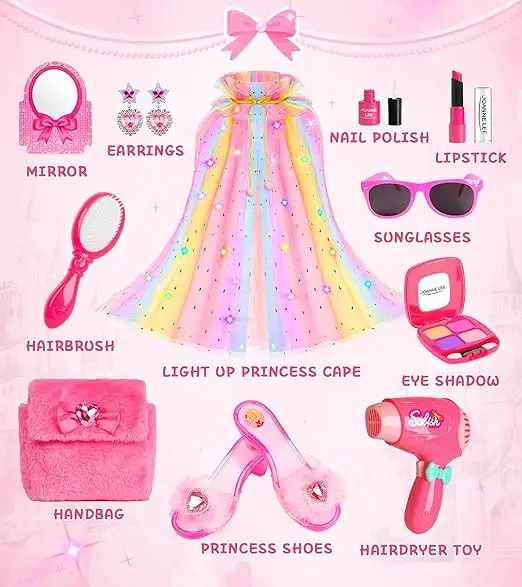 ·All-in-one Princess Gift: Imagine your little one hosting a glam party. Friends take turns as getting makeovers with pretend blush brushes and clip-on earrings. Later, they parade in sunglasses and capes, giggling as they "walk the runway" (your living room carpet!). At cleanup time, everything tucks neatly into the box… until tomorrow’s new adventure
