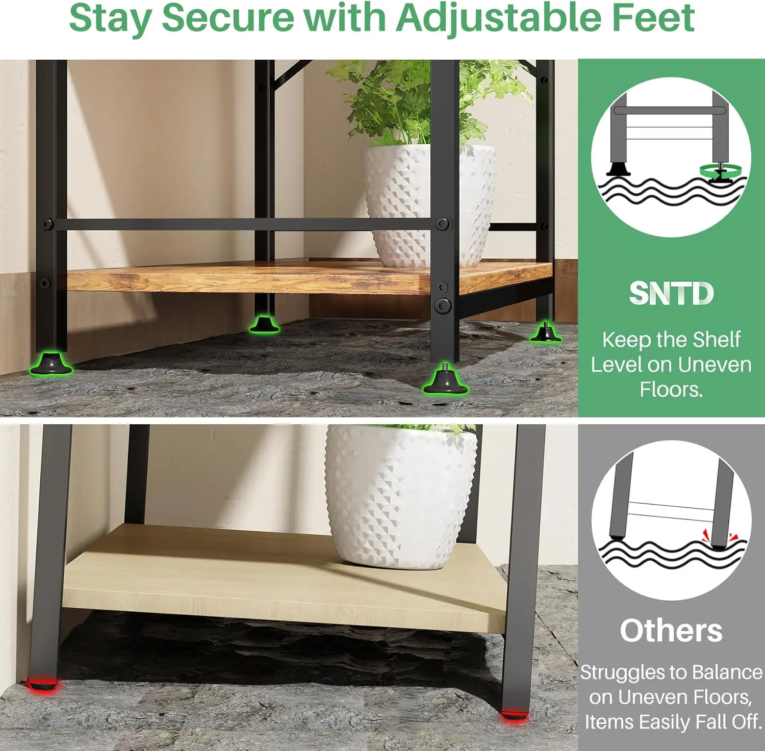 ·Metal Frame, Triple X-Shaped Reinforcement: Built for durability, this microwave stand features a strong metal frame with three X-shaped braces, ensuring long-term stability and reliable performance. The X-shaped braces on the sides and back distribute weight evenly, preventing strain on individual components and maintaining stability even under heavy loads. Adjustable foot pads offer enhanced balance on uneven floors and protect surfaces from scratches. For extra security, the included anti-tip kit can fasten the rack to the wall, ensuring greater stability and safety.