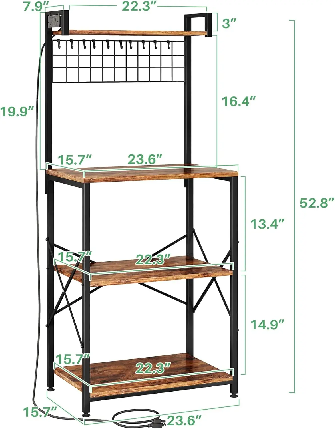 ·Large Storage Capacity: Maximize your kitchen’s storage with this versatile bakers rack. Featuring 3 spacious wooden tiers, an additional top storage shelf, and 10 detachable S-shaped hanging hooks, this kitchen rack expands your storage potential. Whether you're organizing baking supplies, cookware, or kitchen gadgets, this kitche rack has the space you need to keep everything neatly stored and easily accessible. Dimensions: 23.5" L x 15.6" W x 52.8" H.