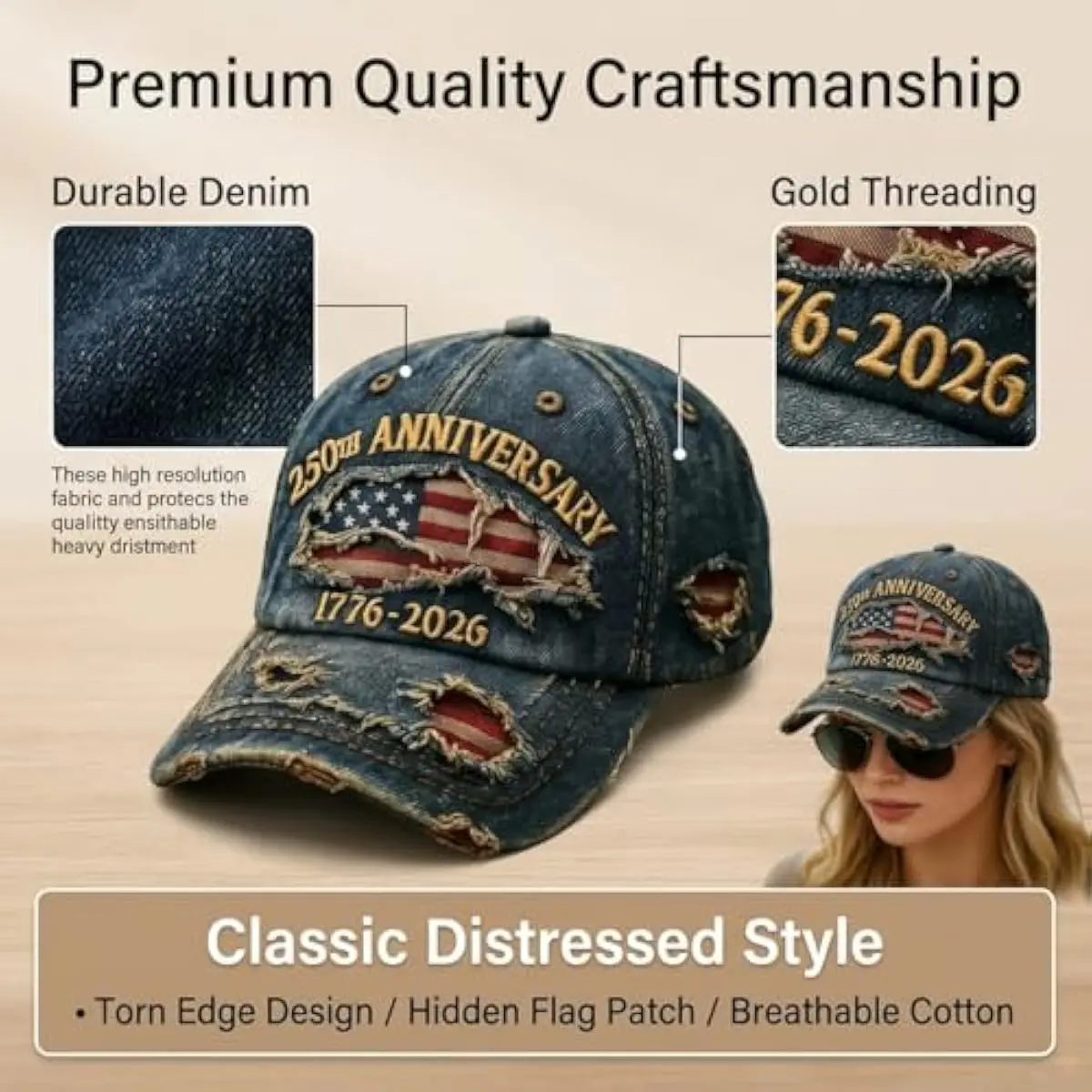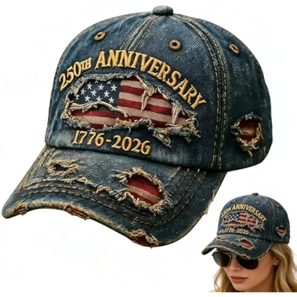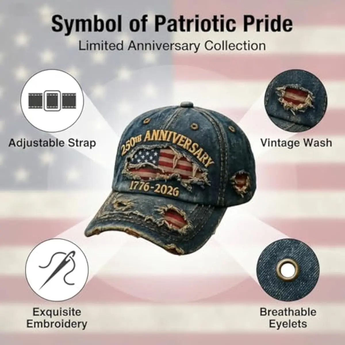 This cap commemorates the USA's 250th anniversary from 1776-2026. It's a unique tribute to patriots and veterans. The distressed design adds a distinctive flair, making it a standout accessory. Ideal for those who cherish American history.