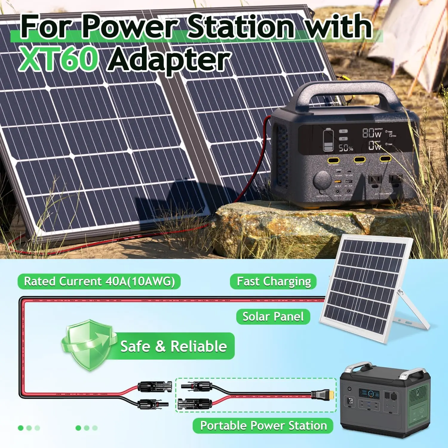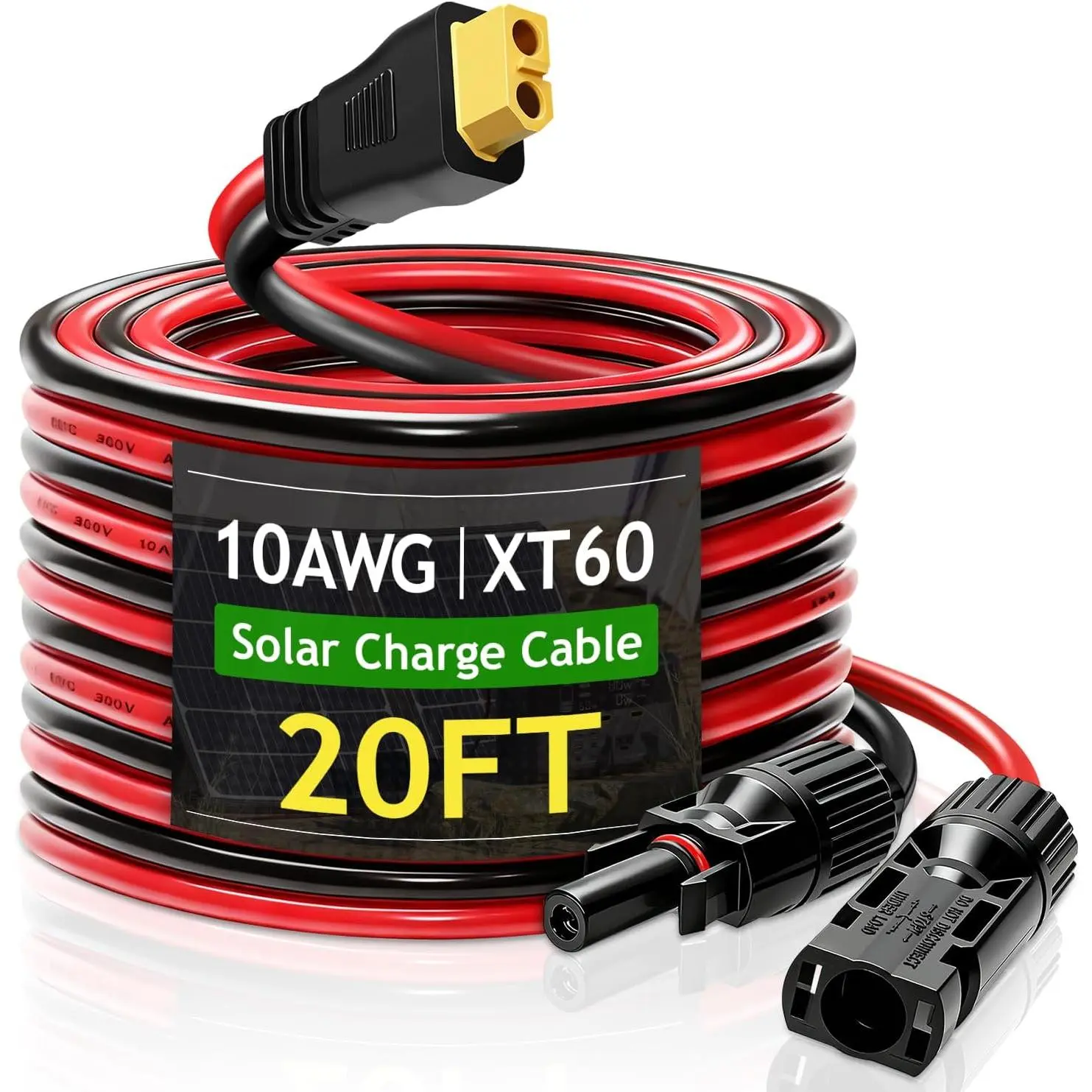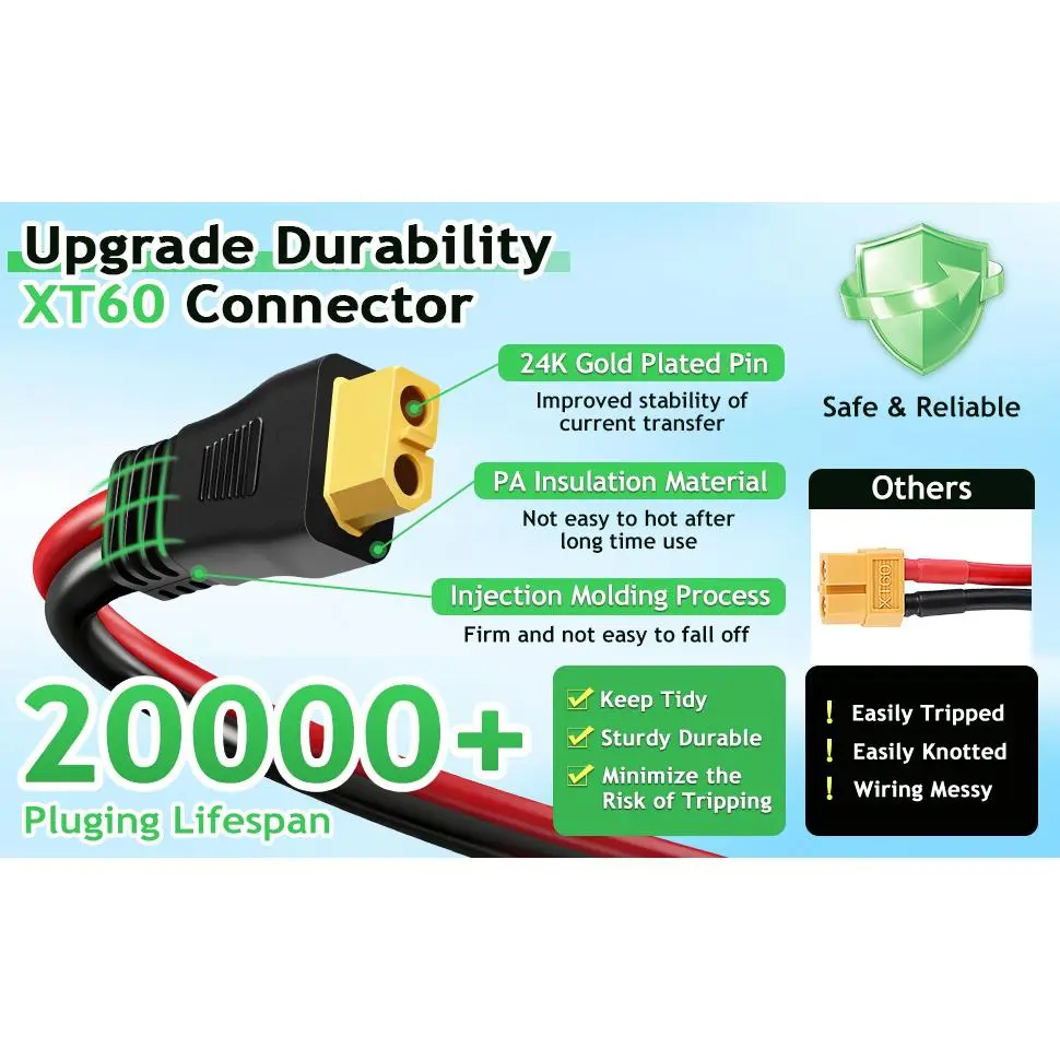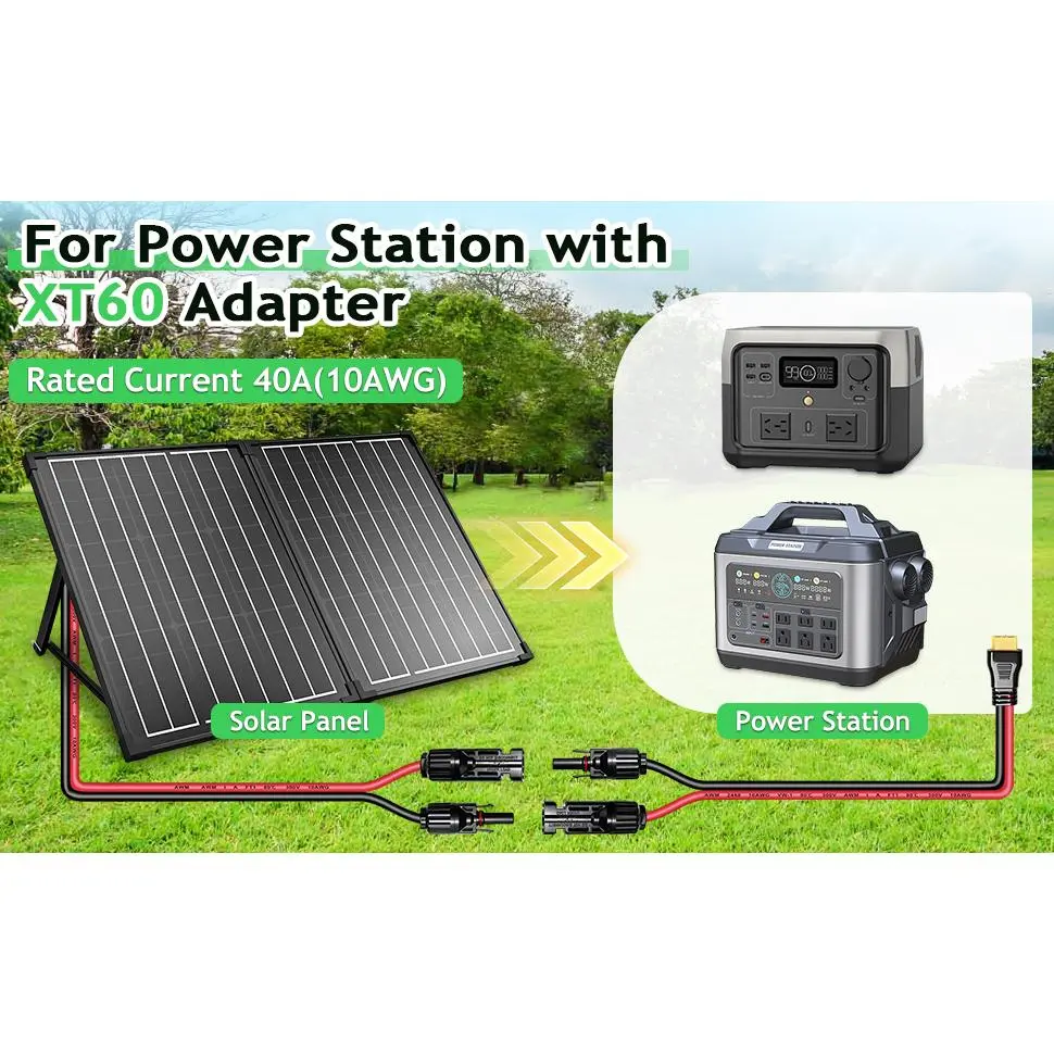 [XT60 Solar Cable made in Premium Copper Core]This 10AWG XT60 solar extension cable features a pure copper conductor, significantly reducing power loss and enhancing charging efficiency.The XLPE sheath and XLPO insulation materials ensure resistance to extreme temperatures (-40°F to 221°F), corrosion, and ultraviolet radiation.This solar panel cable is designed to endure harsh weather conditions, making it ideal for outdoor use.[High-Efficiency Charging Cable]Our XT60 to solar charging cable made of oxygen-free copper wire with low contact resistance and high current and high voltage load capacity(up to 600V), which ensures faster transmission, minimizes power loss, keeping your devices charged safely and efficiently.Voltage: 600V(max).Rated current: 40A (50A max.), Conductor resistance: (20°C) ≤3.5Ω/KM.[Safe Design & Easy Installation]This Solar Panel Connector to XT60 cable includes three connectors: a Y-type solar panel plug (with male/female options) featuring a red waterproof IP68 ring to prevent water or dust ingress, and an XT60 connector compatible with all solar generator power stations, battery packs, and devices with XT60 ports.[20000+ Bend XT60 Panel Solar Cable] With a tested lifespan exceeding 20,000 bends and plug cycles, this XT60 parallel solar cable is designed for longevity.The reinforced injection molding design enhances structural integrity, ensuring secure connections and reducing wear over time.[Ideal for Solar Power Systems] This XT60 solar panel extension cable is designed to connect solar panels to solar generators, inverters, charge controllers, and other power system components . The XT60 connectors are universally compatible with solar generator power stations, battery packs, and devices featuring XT60 ports , making it a versatile solution for both residential and commercial applications .