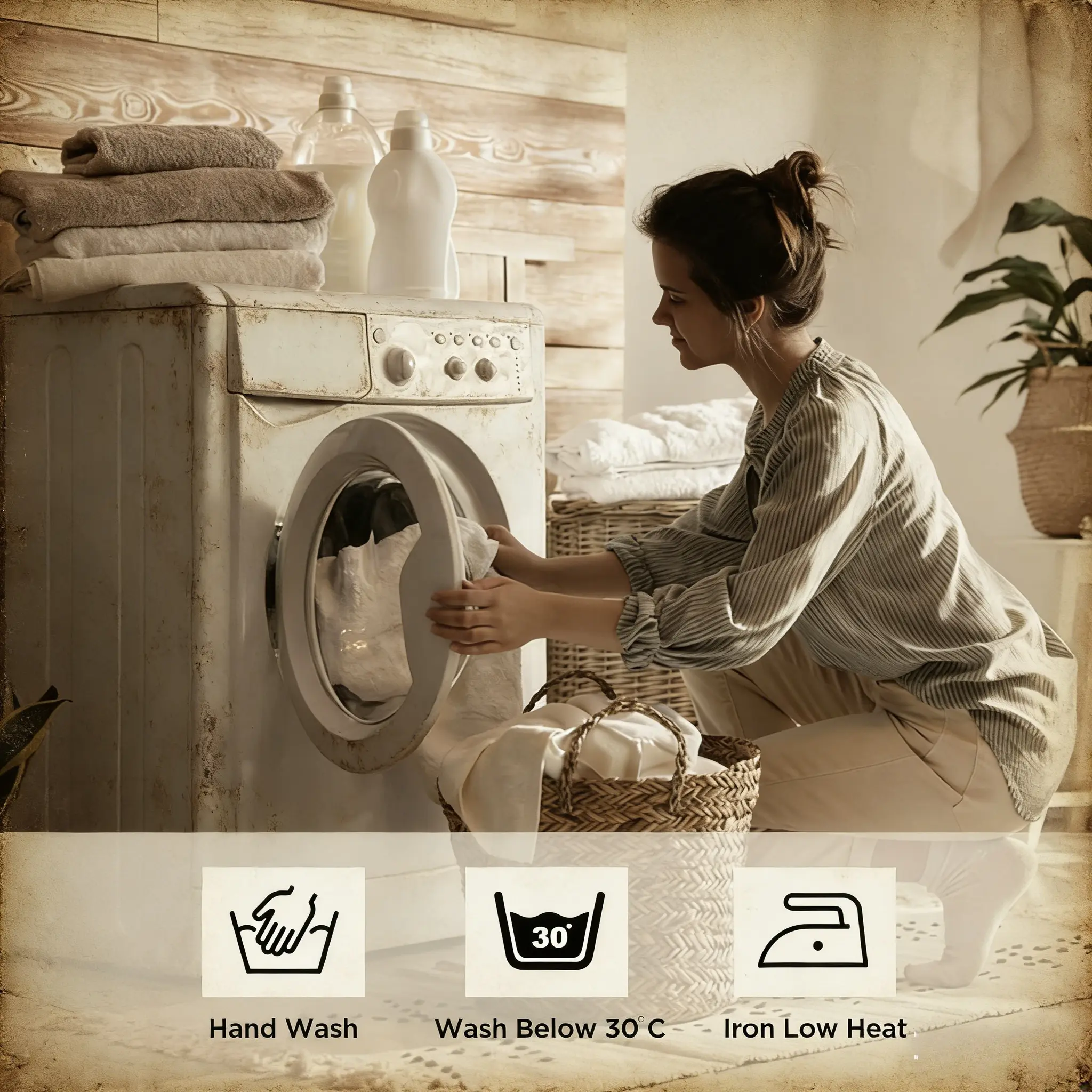 Machine washable or gentle hand wash in cold water. Iron on low temperature to remove creases.