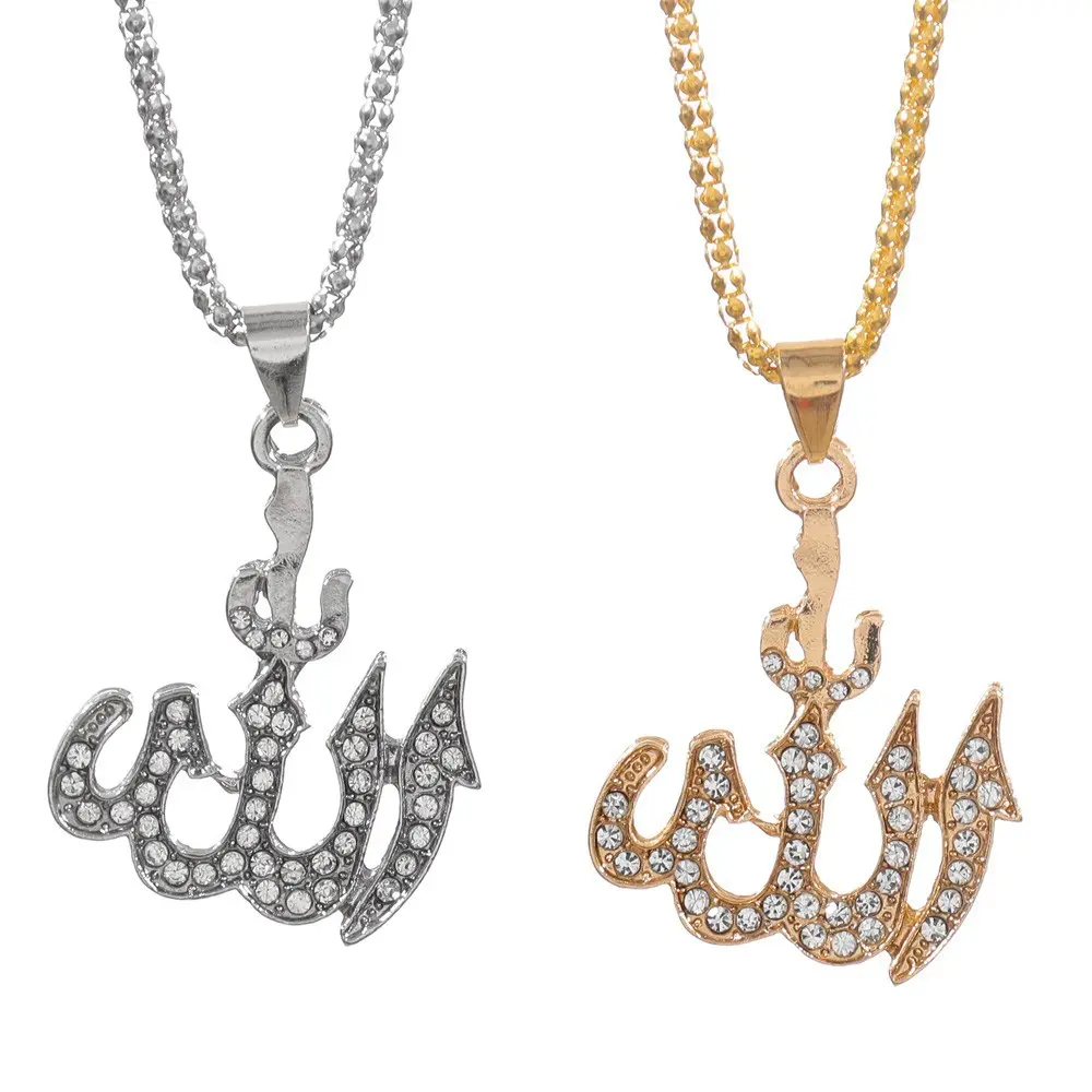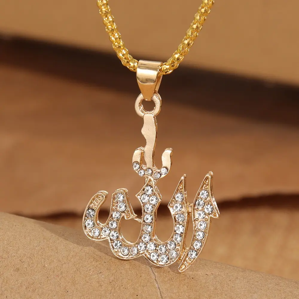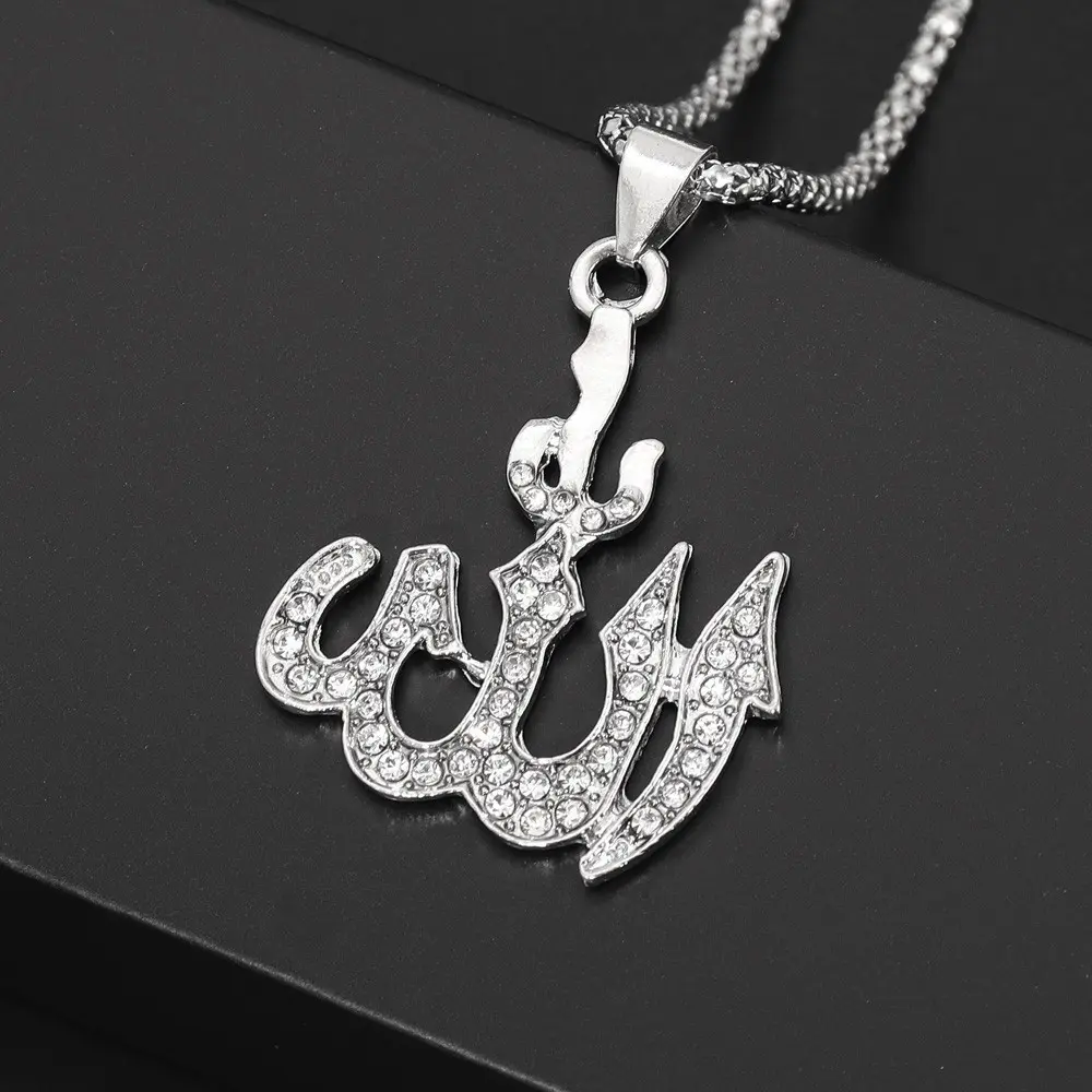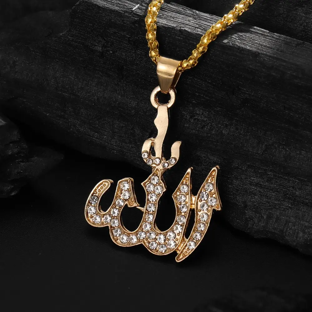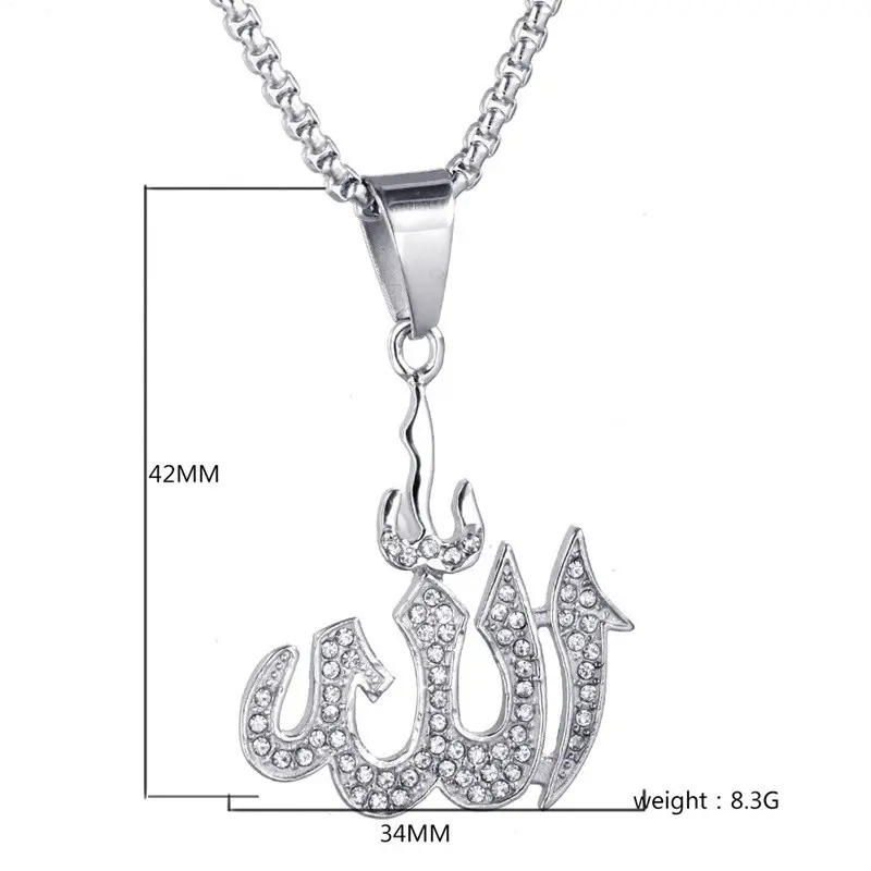 Elevate your spiritual style with this dazzling Islamic Allah pendant necklace set, a timeless symbol of faith and devotion. Available in two luxurious finishes—polished 18K gold-tone and sleek silver-tone—each necklace features a highly detailed Arabic calligraphy "Allah" motif meticulously encrusted with sparkling cubic zirconia stones that catch light from every angle. The pendant hangs from a durable, flexible twisted rope chain, secured with a sturdy clasp for long-lasting wear. More than just an accessory, this piece serves as a meaningful reminder of belief and spirituality, perfect for daily wear, religious celebrations, or as a thoughtful gift for a loved one. Lightweight, comfortable, and built to shine, it blends sacred symbolism with brilliant, eye-catching design.