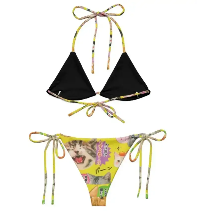 Y2K Cat Print Bikini, Kawaii Cyber Rave Recycled Fabric