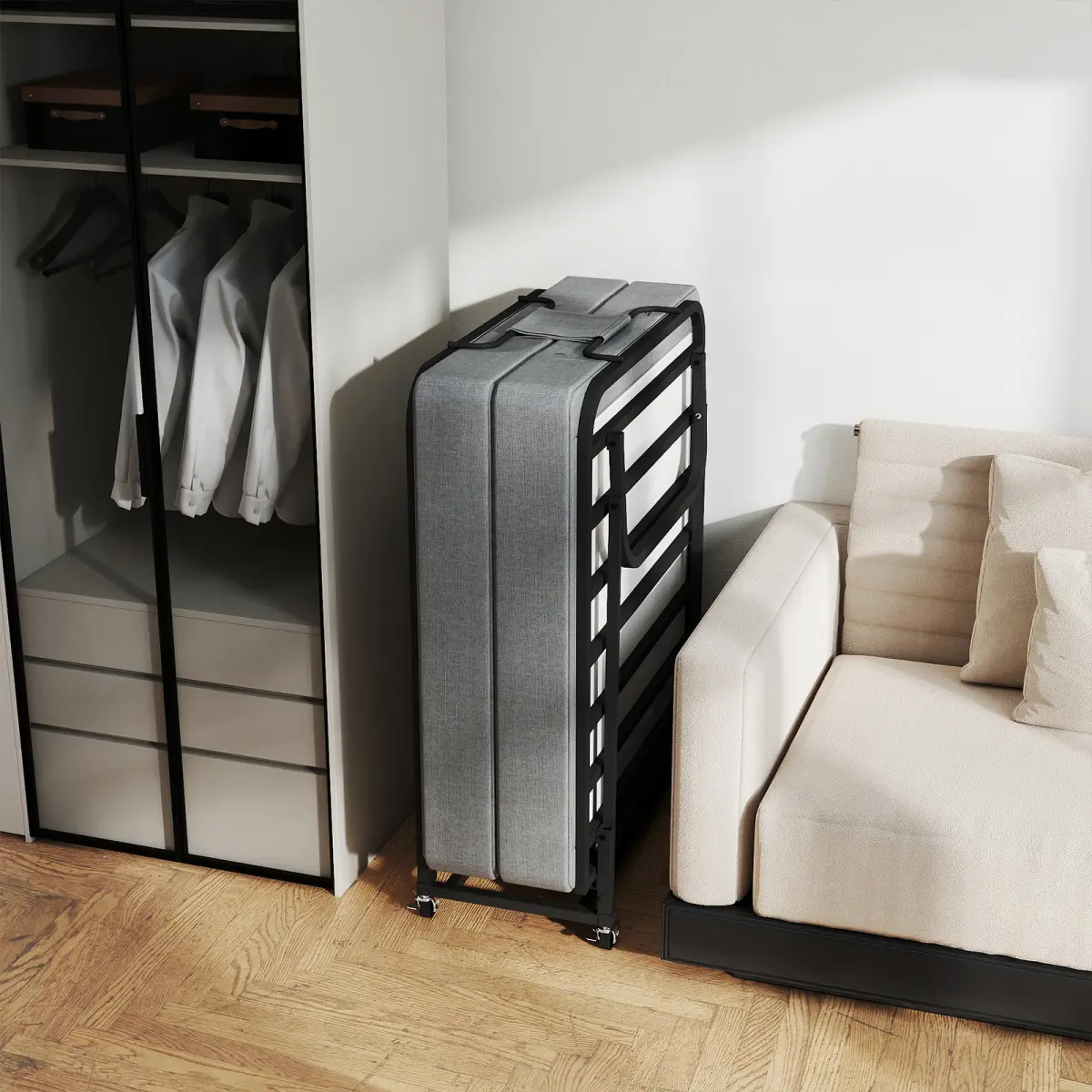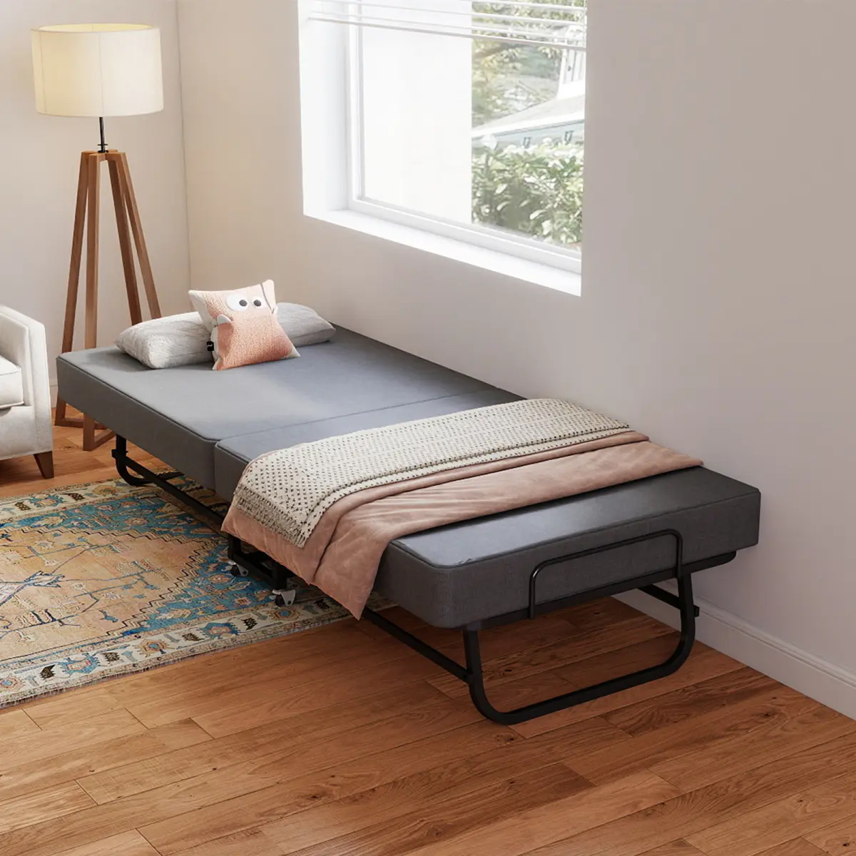 This portable folding bed for adults combines appearance and practicality.Its skin-friendly breathable linen fabric and modern minimalist design fit guest rooms, dormitories, offices and camping.With a stable noise-free reinforced steel frame (450 lbs capacity), memory foam mattress for comfort, lockable universal wheels, compact folding design and removable washable mattress cover, it meets all temporary sleep needs and shows its advantages intuitively with product images.