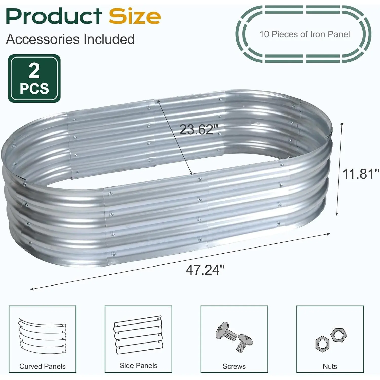 Perfect Size: This plant raised garden bed size is 4 x 2 x 1 Ft. Extra-large space design meets the space needed to grow various plants such as vegetables, fruits, and flowers.Galvanized raised garden bed tidies up and improves the aesthetics of a garden areaPremium Material: Crafted from thick galvanized steel with a rust-resistant coating, this planting bed is built to withstand long-term contact with soil, ensuring exceptional durability and corrosion resistanceBottomless Frame: The open-base structure of this raised garden bed promotes excellent drainage and allows plant roots to extend freely into the ground, fostering healthier and more robust growthUpgraded Structure: The elegant oval design not only enhances visual appeal but also provides greater structural stability.It withstands higher pressure at the joints, resists deformation, and ensures the connections stay secure.Built for longevity, this design can be used for years to comeEasy Assembly: Set up your garden bed in just a few simple steps! With minimal time and effort, you’ll have it ready to plant and enjoy