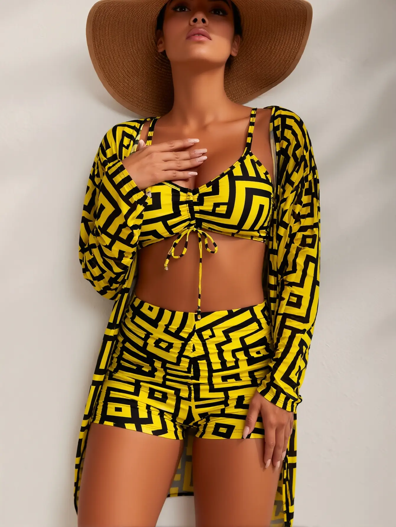 This chic set includes a long sleeve sheer cover-up top, a tie front swim bra, and shorts. Ideal for beach holidays, it combines style with functionality. The geometric print adds a modern touch to your swimwear. Perfect for those who love a fashionable yet comfortable beach look.