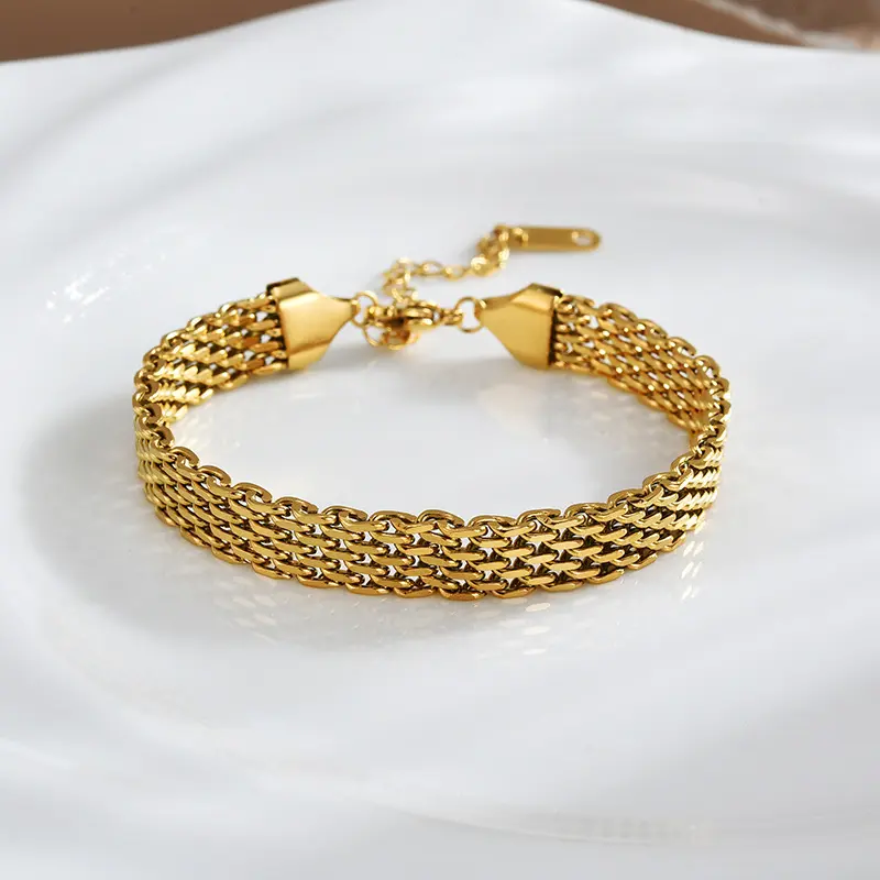 This multi-row chain bracelet is a sophisticated blend of timeless elegance and modern versatility. Available in lustrous gold and sleek silver finishes, it features a tightly interwoven, textured link design that adds depth and dimension to any outfit. Crafted from durable, hypoallergenic metal, it resists tarnish and is comfortable for all-day wear. Its flexible, snug fit sits smoothly on the wrist, making it perfect for layering with other jewelry or wearing alone as a statement piece. Ideal for both casual and formal occasions, this bracelet effortlessly elevates your style—whether you’re dressing up for an event or adding polish to everyday looks. A thoughtful gift for anyone who appreciates refined, understated luxury.