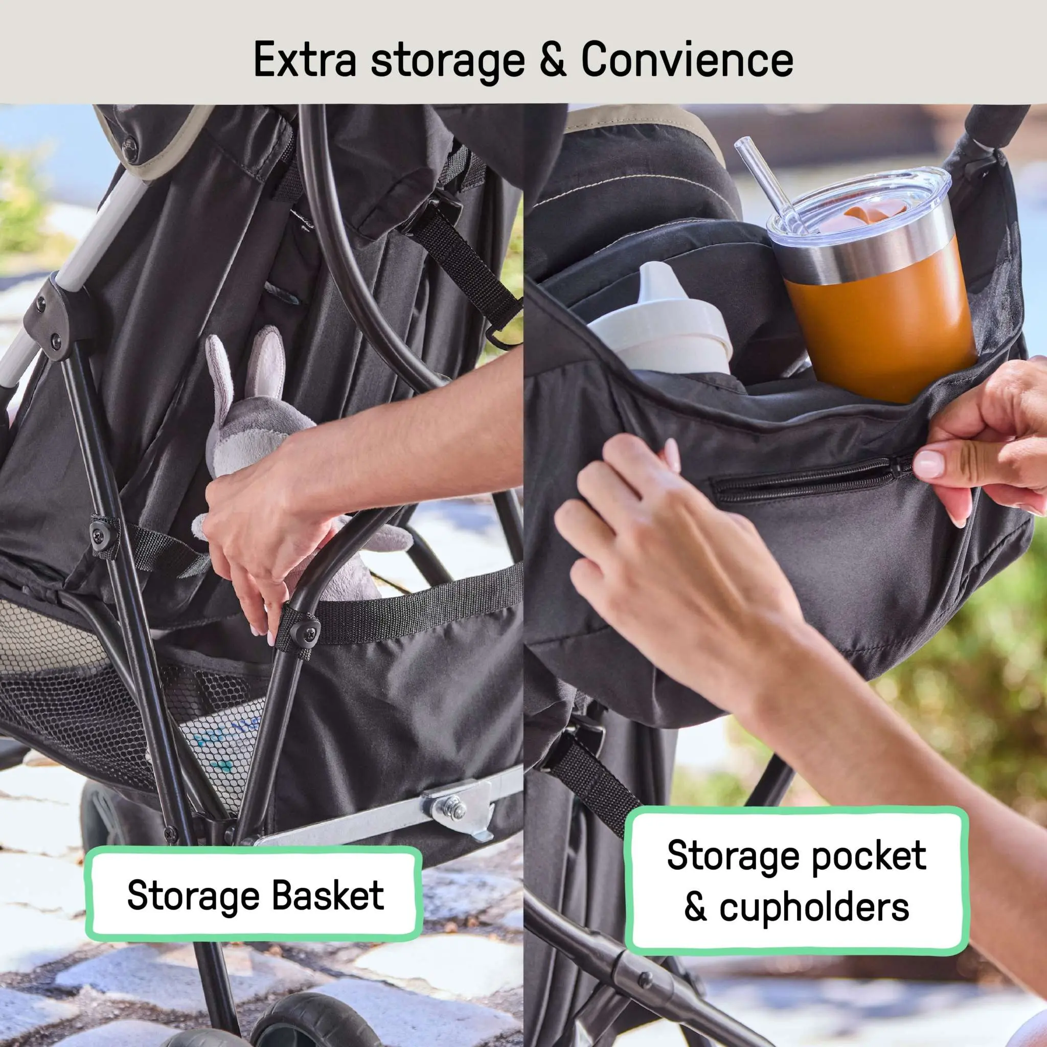 ·EXTRA STORAGE - With plenty of storage in this stroller, you won’t have to leave anything at home; It includes a storage basket, rear storage pocket and two cup holders
