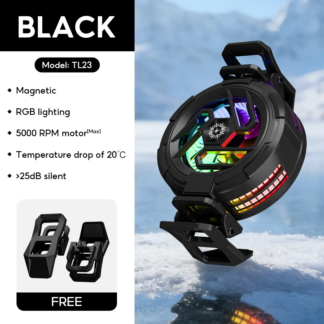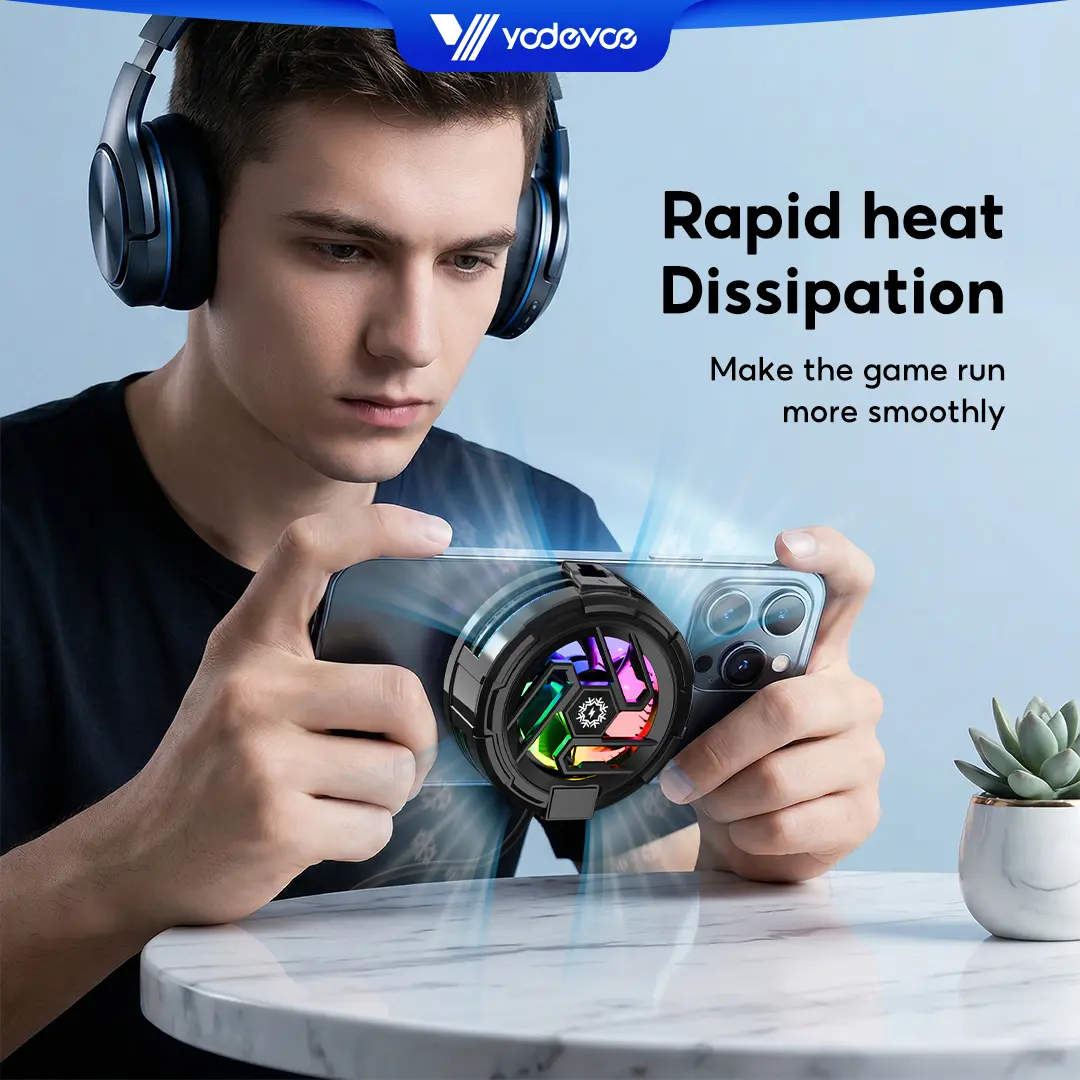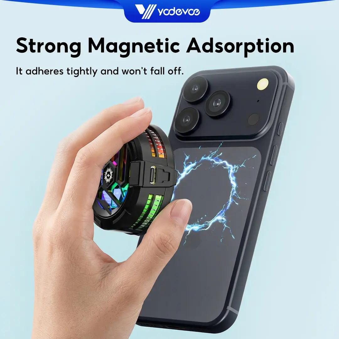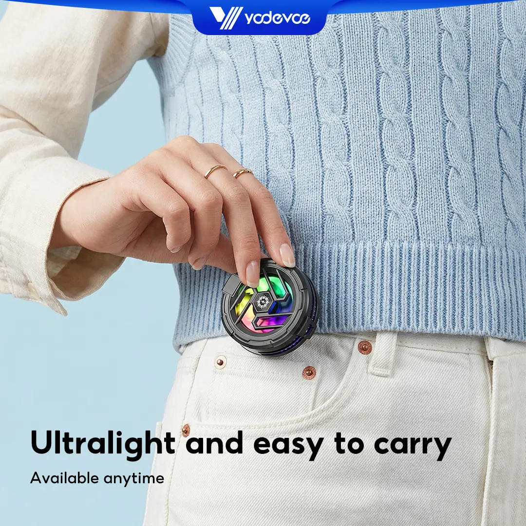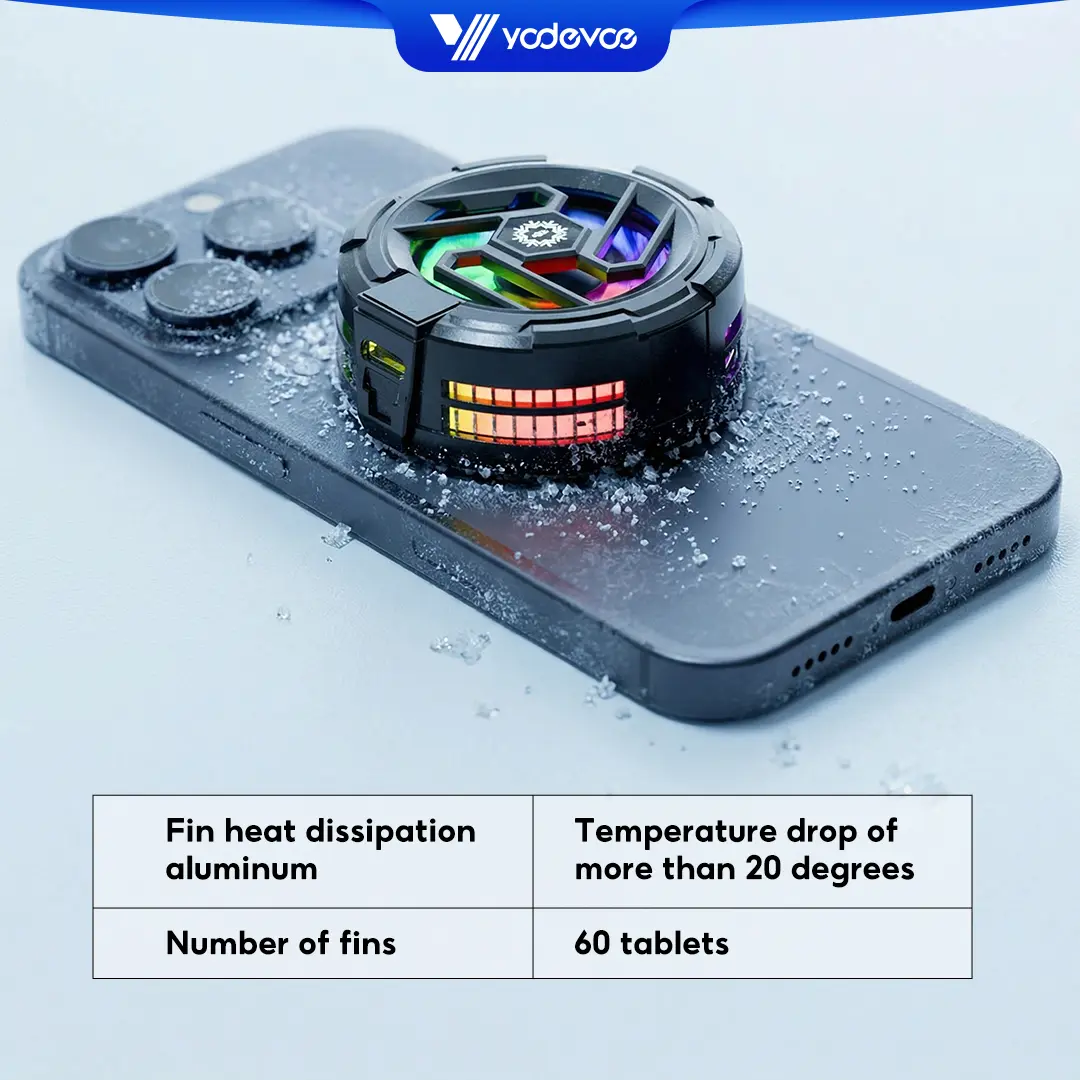 5. Yodevoe is a portable phone cooler featuring 15W fast cooling and AI intelligent cooling, capable of rapidly reducing phone temperature within 15 seconds. It also offers 100 adjustable cooling modes and three-color ambient lighting effects.