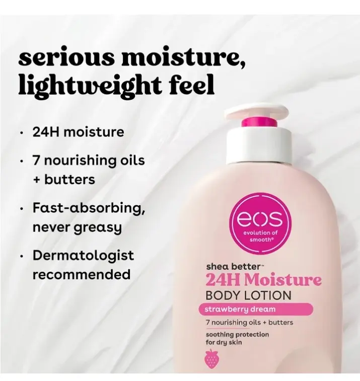 ·ALL-NATURAL SHEA BUTTER: eos products have wild grown, sustainably-sourced 100% natural shea butter to make skin feel moisturized, protected and soft. We are paraben, phthalate and gluten free. Dermatologist-recommended. Vegan. Hypoallergenic. Cruelty-free.