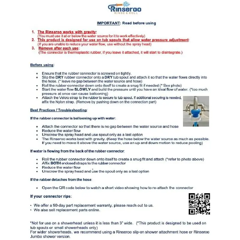 TUB RINSING MADE EASY: You’ll love our bathtub faucet sprayer because it’s easy to use and instantly turns any faucet into a swift rinsing station. With no installation needed, it's ideal for a quick dog bath or other speedy tub rinsing chores. FIT: The Rinseroo Tub Version instantly attaches to your bathroom faucet attachment (up to 3" in diameter). Our tub faucet sprayer attachment has a portable design and moves from tub to tub with ease! VERSATILE DESIGN: Not just for the bathroom, our dog washing hose attachment is a game changer. Add a hose to extend its reach and turn your faucet into a dog shower head, a plant rinser, and more. NO TOOLS, NO STRESS: Skip the hassle of complicated setups. This lightweight faucet sprayer attachment slips on in seconds and coils up for neat storage, making it the go-to for a quick dog shower or tub clean-up. THERE ARE SO MANY THINGS IT CAN DO: Transform your bathtub faucet adapter into a powerful shower attachment, give your pet a dog bath, fill a portable washing machine, and more. This tub faucet attachment simplifies so many of our least favorite chores.