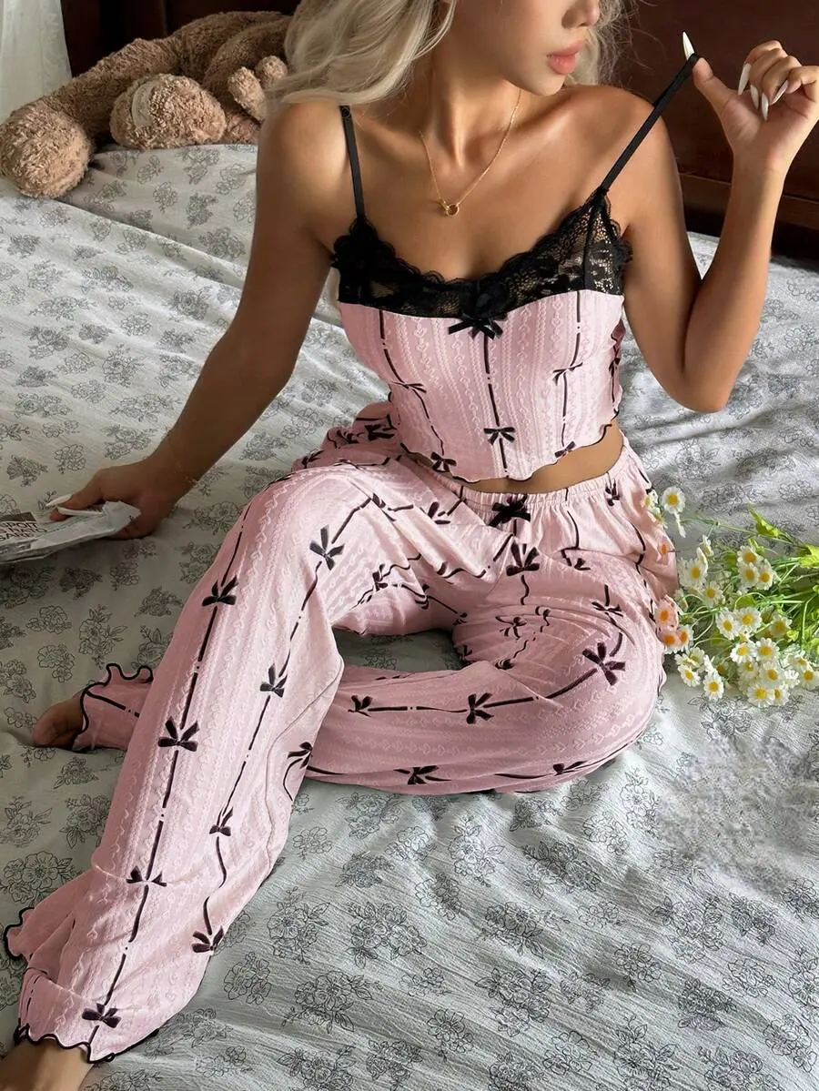 MONASWEET Contrast Lace Tie Front Cami PJ Set / Pajama Set Holiday Season