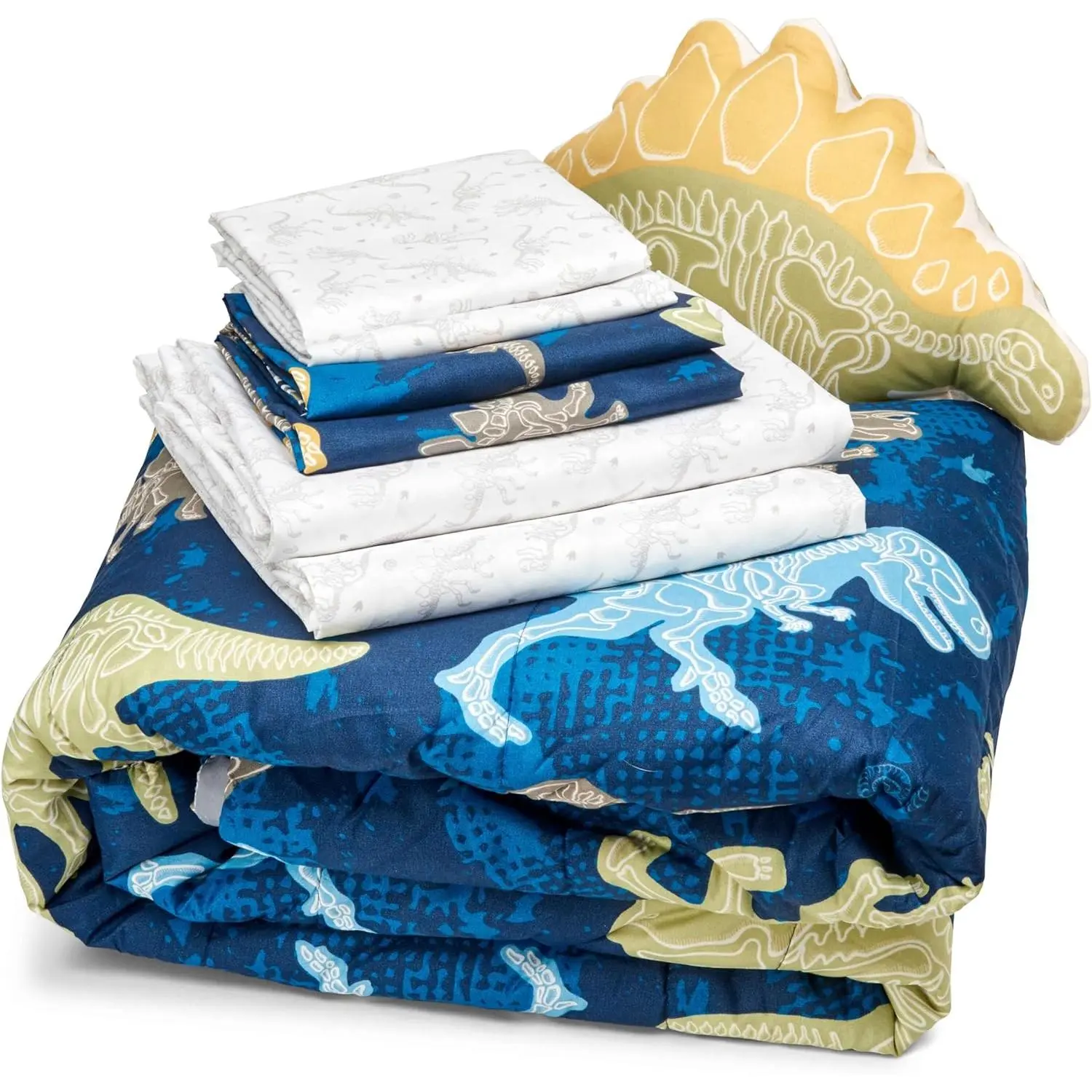 100% PolyesterComforter features multiple dinosaurs on navy background with striped reversesheets are white with grey dinosaursdinosaur shaped decorative pillowSoft, cozy and warmSet comes with comforter, two shams, two pillowcases, flat sheet, fitted sheet and decorative dino-shaped pillowComforter measures 66"W x 86"LShams measure 20"W x 26"LPillowcases measure 20"W x 30"LFitted Sheet measures 54"W x 75"L with 12" pocketFlat Sheet measures 81"W x 96"LDecorative Pillow measures 16"W x 9"LComforter: Machine wash cold separately using delicate cycle and mild detergentDo not bleachUse large capacity, commercial machineMachine dry separately on gentle cycleRemove promptlyDo not ironComforter Shell, Shams, Sheets, Pillowcases, and Pillow: 100% PolyesterComforter fill: 100% Polyester Fiber