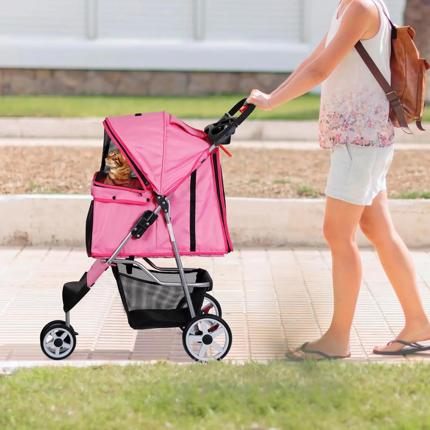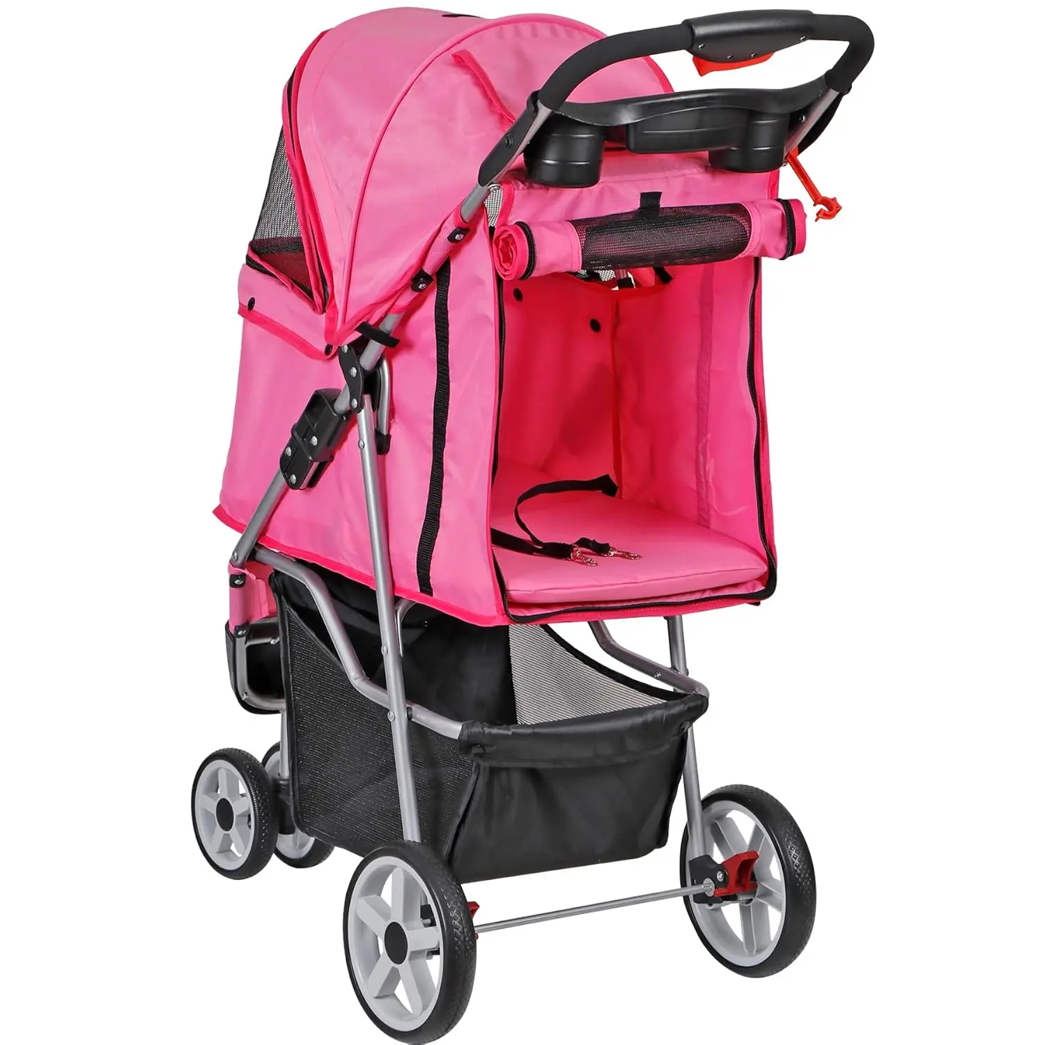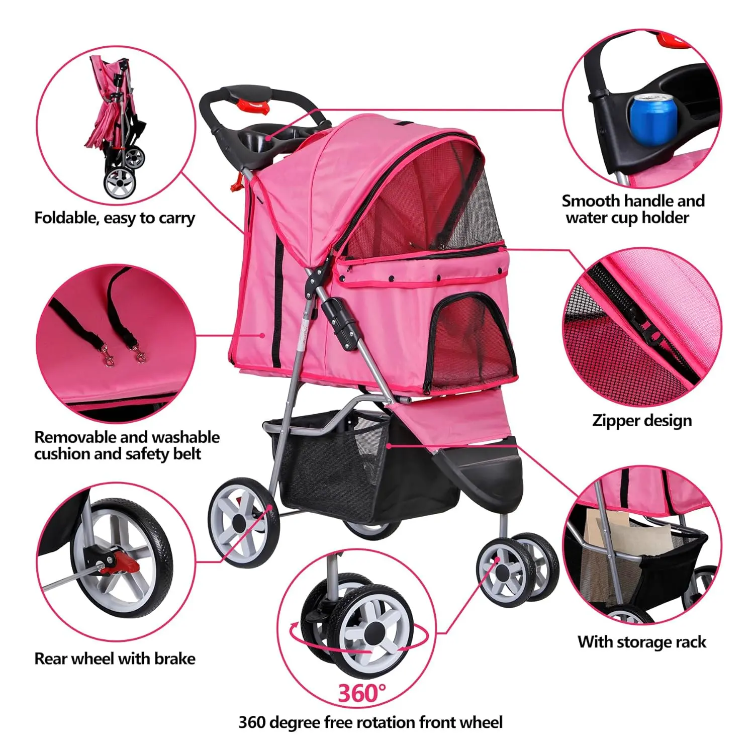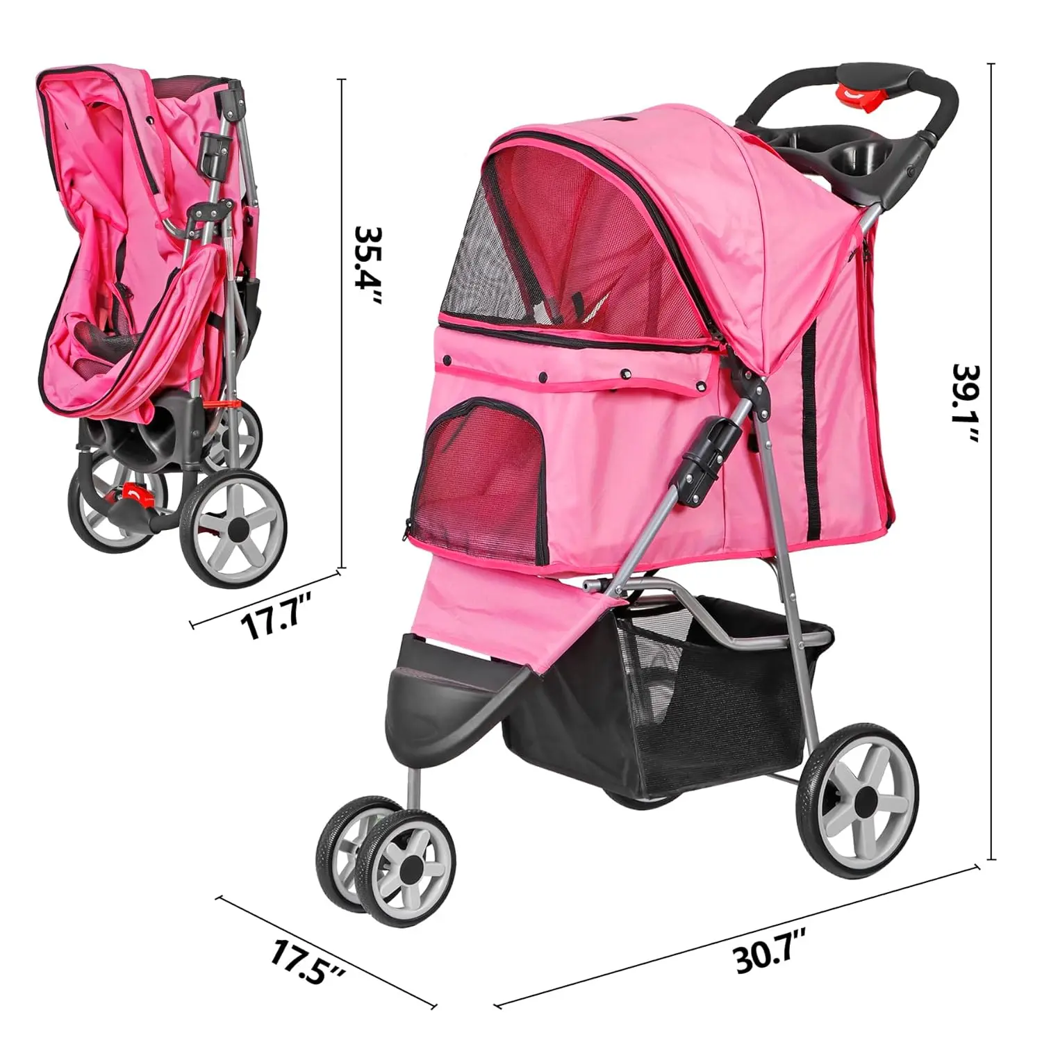 Foldable Pet Stroller for Cats and Dogs 3 Wheels Carrier Strolling Cart with Weather Cover, Storage Basket + Cup Holder (Pink)