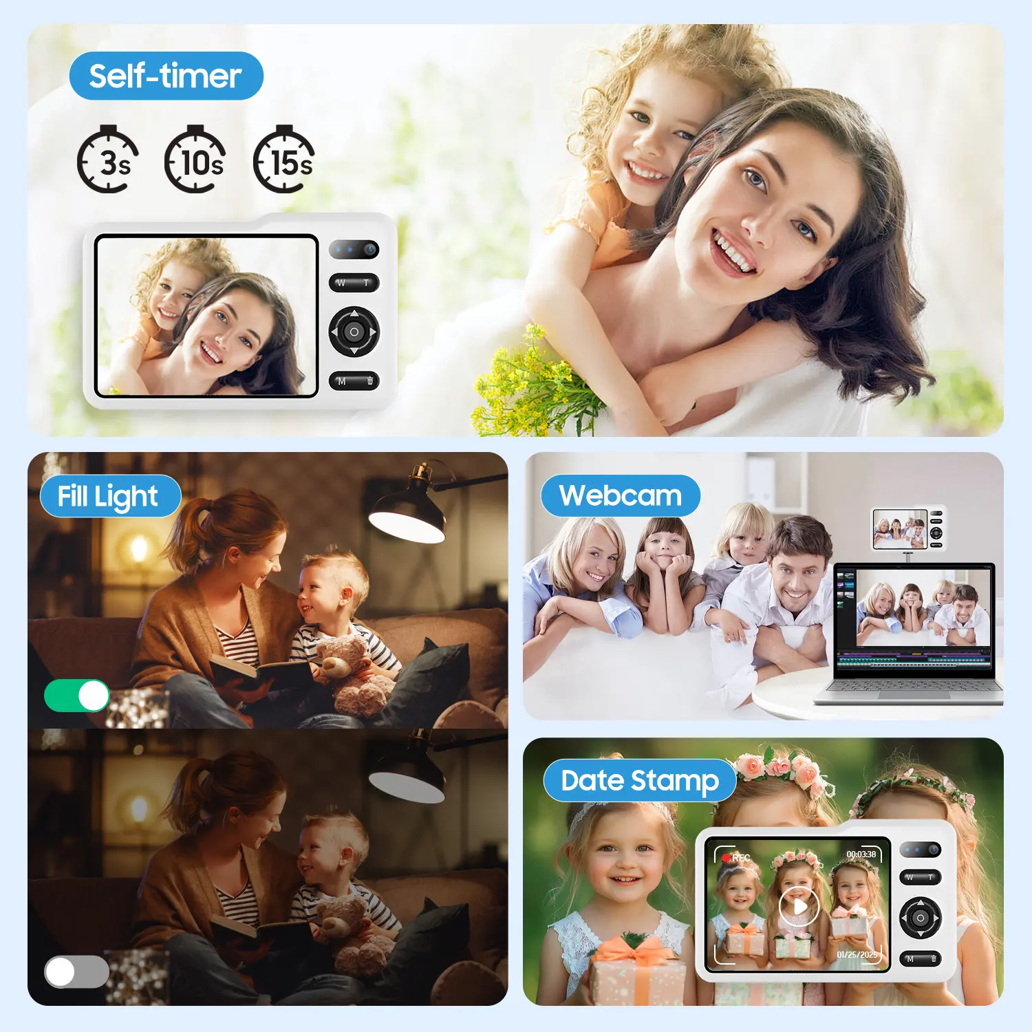 A wealth of practical features: 3/10/15-second self-timer, webcam mode, and date watermark—meeting all your child’s photography needs