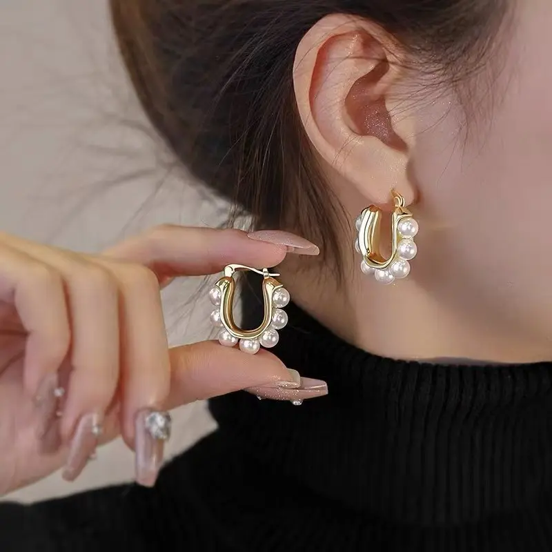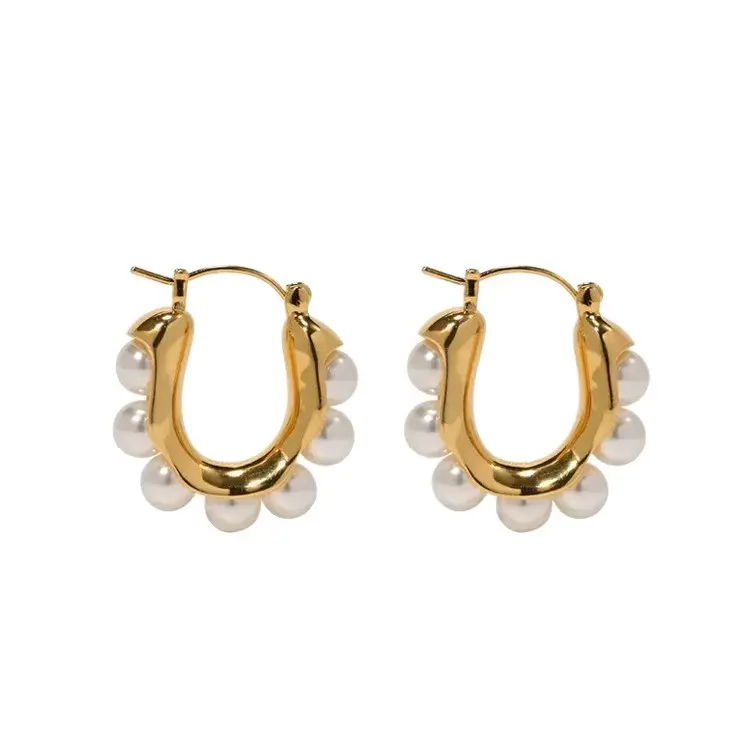 -the ultimate blend of timeless elegance and modern luxury.Crafted with a polished gold-plated U-shaped hoop, each earring is adorned with a row of lustrous, high-shine faux pearls, creating a sophisticated, eye-catching silhouette that embodies classic Parisian chic.