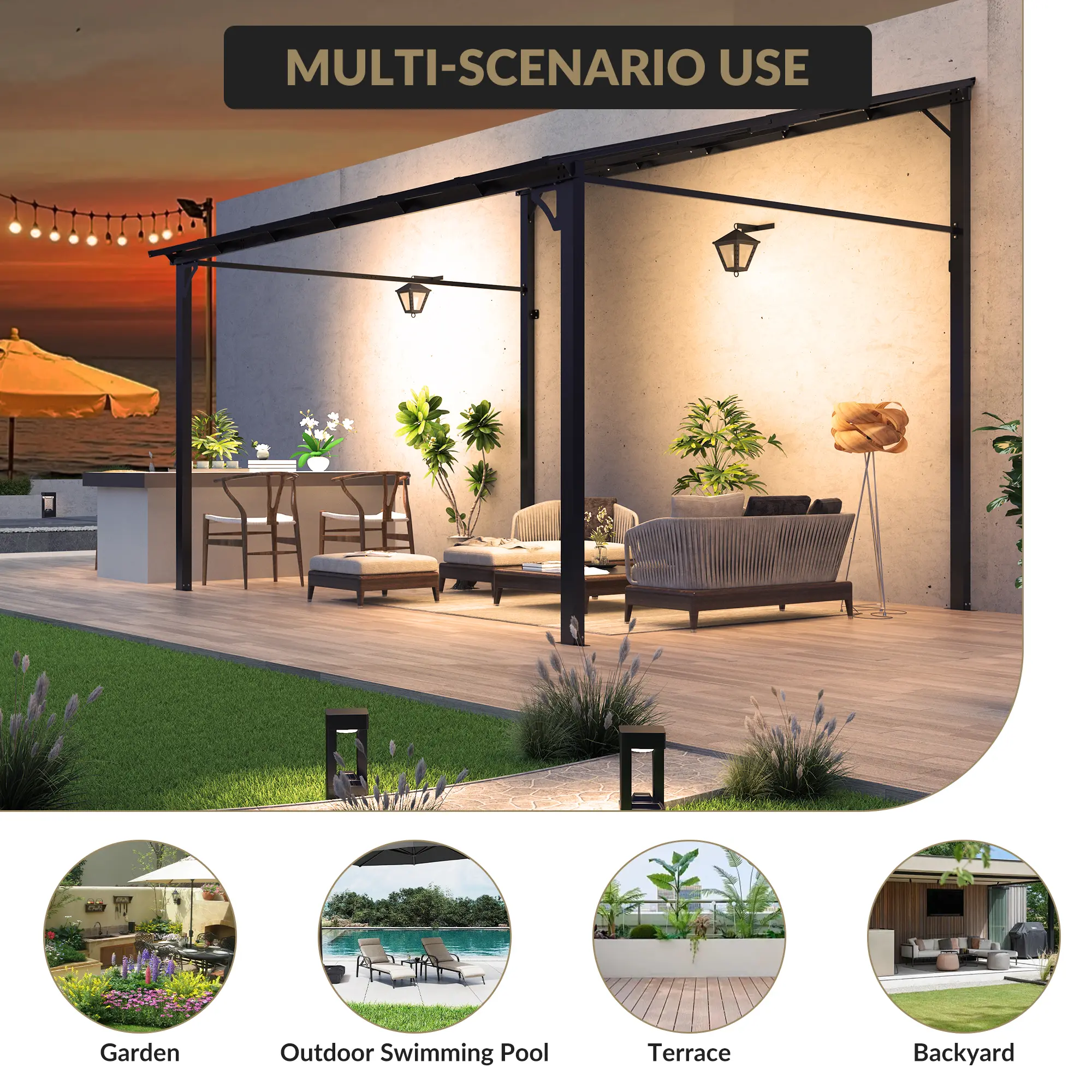 ·Versatile & Stylish Outdoor Shelter: Perfect for outdoor dining, entertaining, or relaxing by the pool, this pergola comfortably accommodates 10-12 standing guests, 6-8 seated, or 4-6 diners. Ideal for morning coffee, BBQs, or social gatherings.