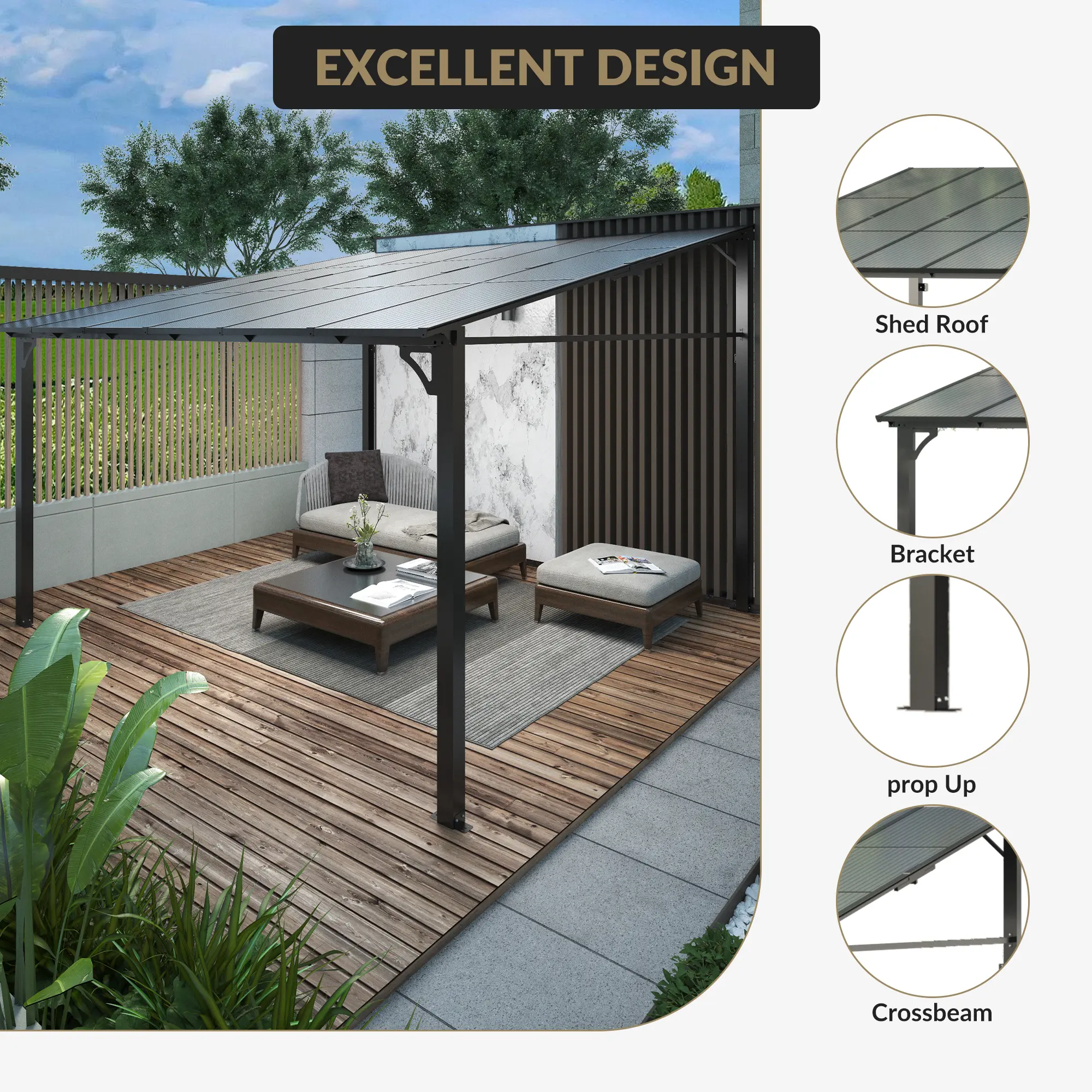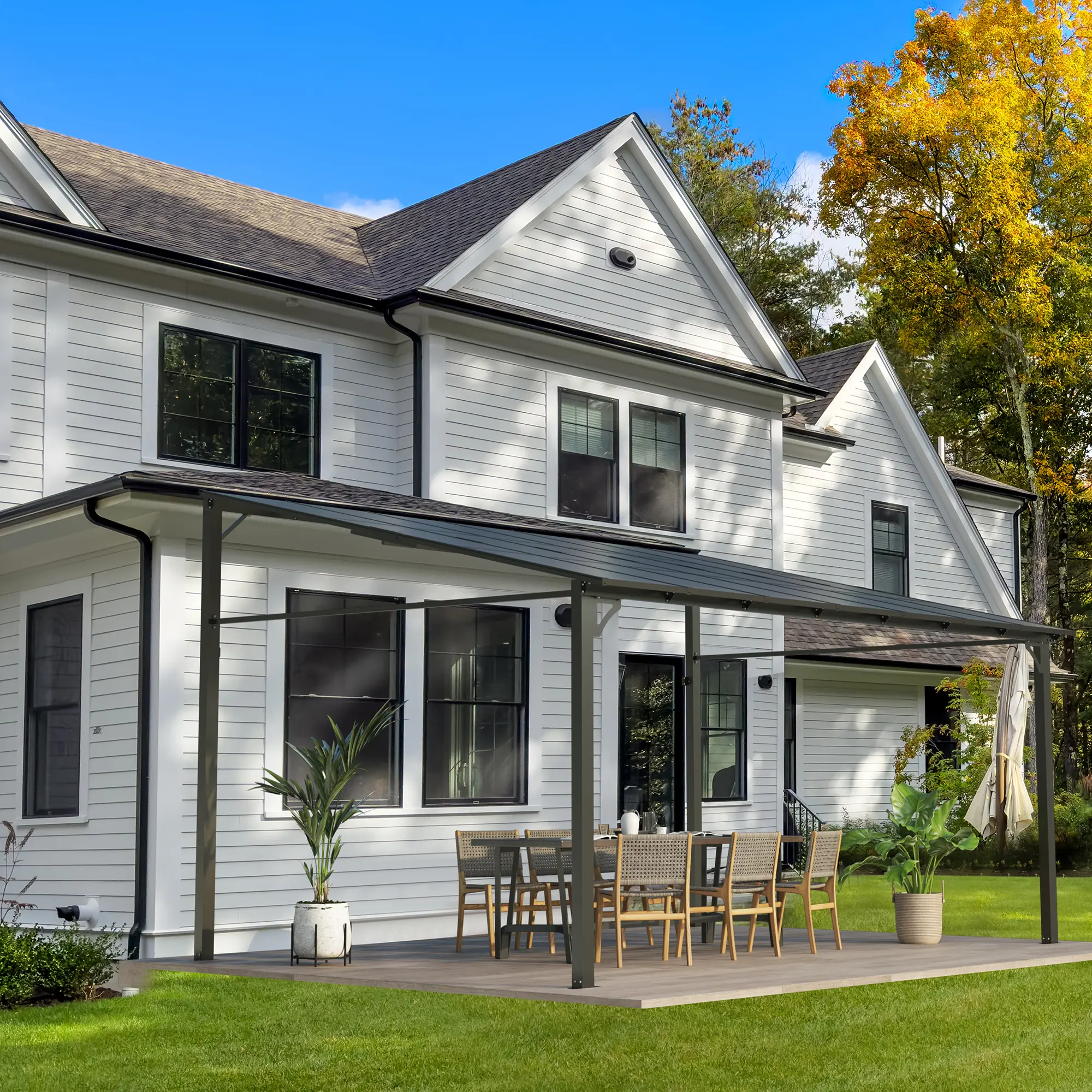 ·Weather-Resistant All Year Round: Designed to perform in temperatures from -20°C to 50°C and humidity over 90%, the robust sloped hardtop roof and integrated gap drainage system protect your space from rain, snow, and intense sunlight. UV-resistant polycarbonate panels (UPF>40) let natural light in while blocking harmful rays, keeping your patio cool and bright.
