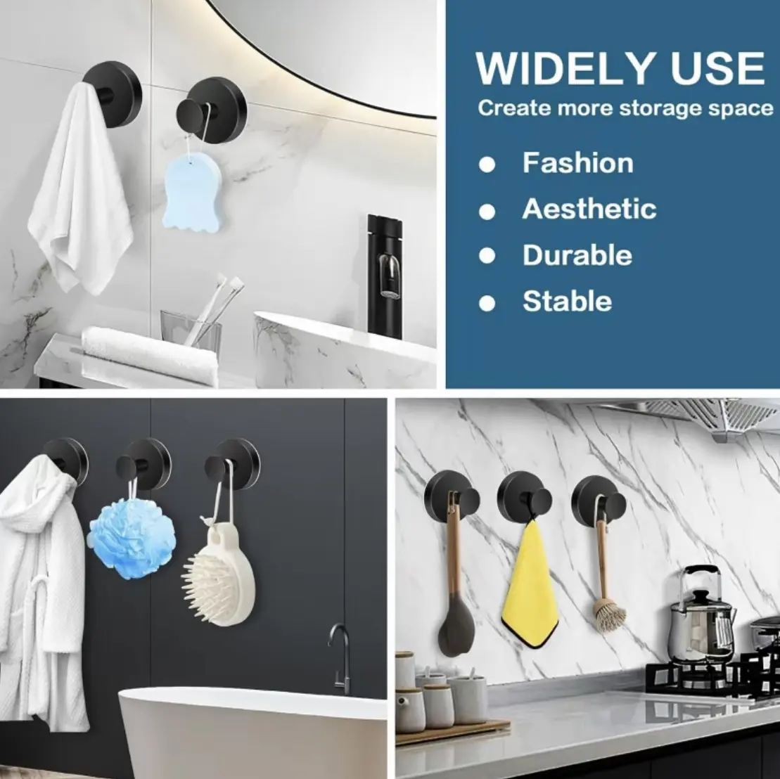 Our suction hooks for shower wall are not just for showers! Use these bathroom towel hooks in the kitchen or any room. These hooks offer strong hold on smooth surfaces. Sleek black hooks blend with any decor, making them a stylish addition. Durable suction cups with hooks ensure a firm grip.