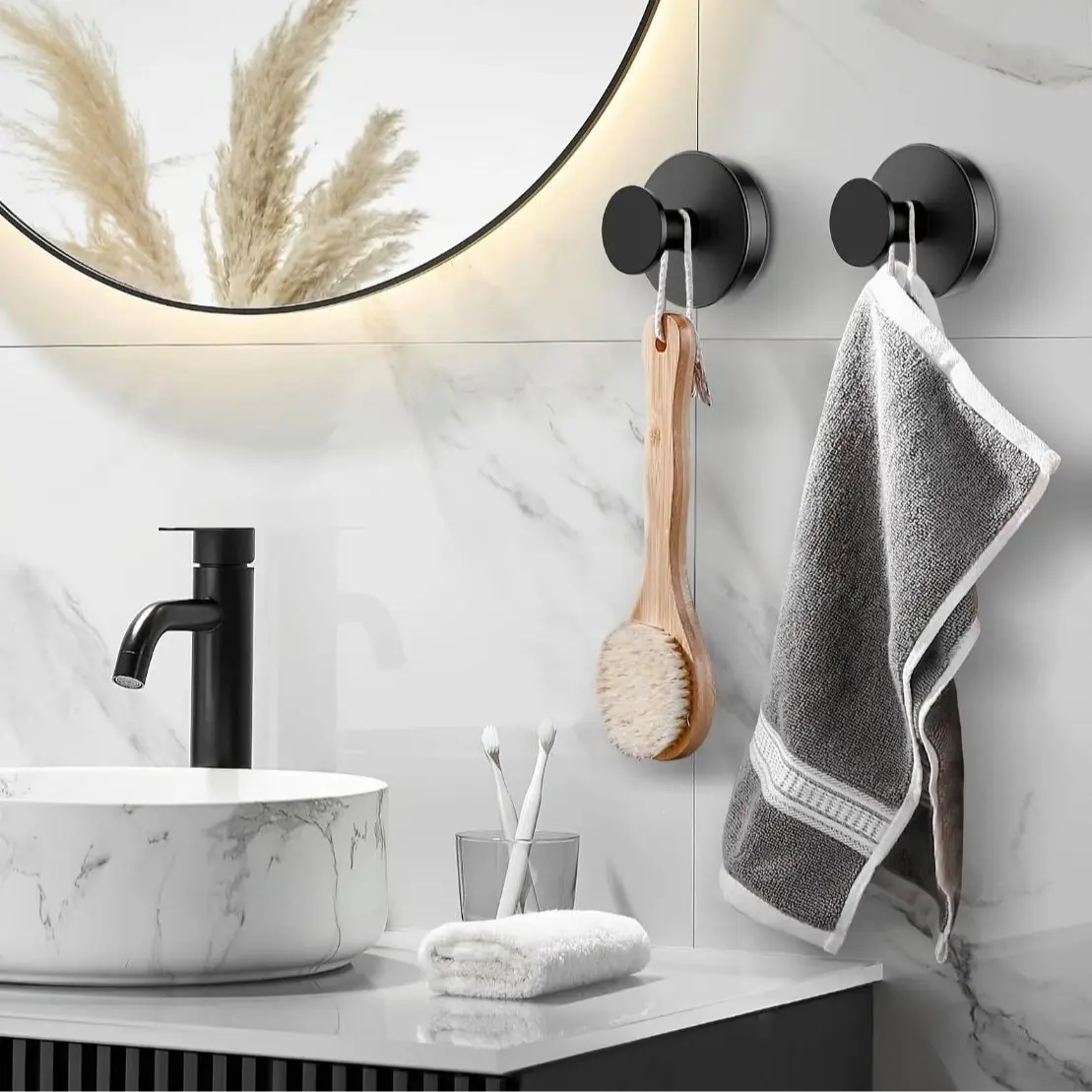 Add a touch of elegance with our black hooks for towels.The shower towel hook blends with any decor, suction hooks for glass making it a stylish addition. Durable suction cups with hooks ensure a firm grip. Enjoy easy installation with our bathroom suction hooks.
