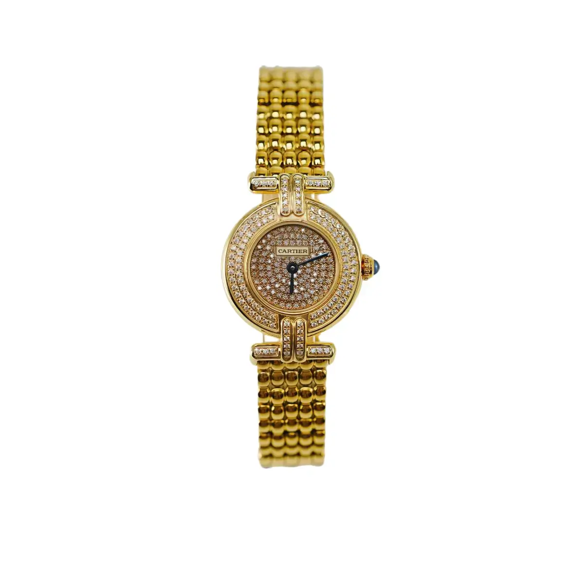 This watch is not just a timepiece but a statement of taste. The golden hue and the intricate detailing on the dial make it a standout piece. Ideal for those who appreciate fine craftsmanship and timeless design. Elevate your wardrobe with this exquisite Cartier watch.