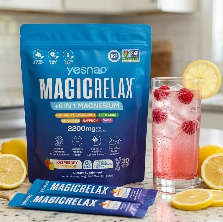 Yesnap MagicRelax 8-in-1 Magnesium Glute Booster, Magnesium KSM-66 Ashwagandha Saffron Vitamin D3 GABA L-Theanine Supports Cortisol Balance Mood Sleep 30 Servings No Sugar Non GMO Raspberry Lemonade Flavor