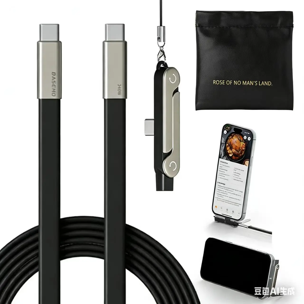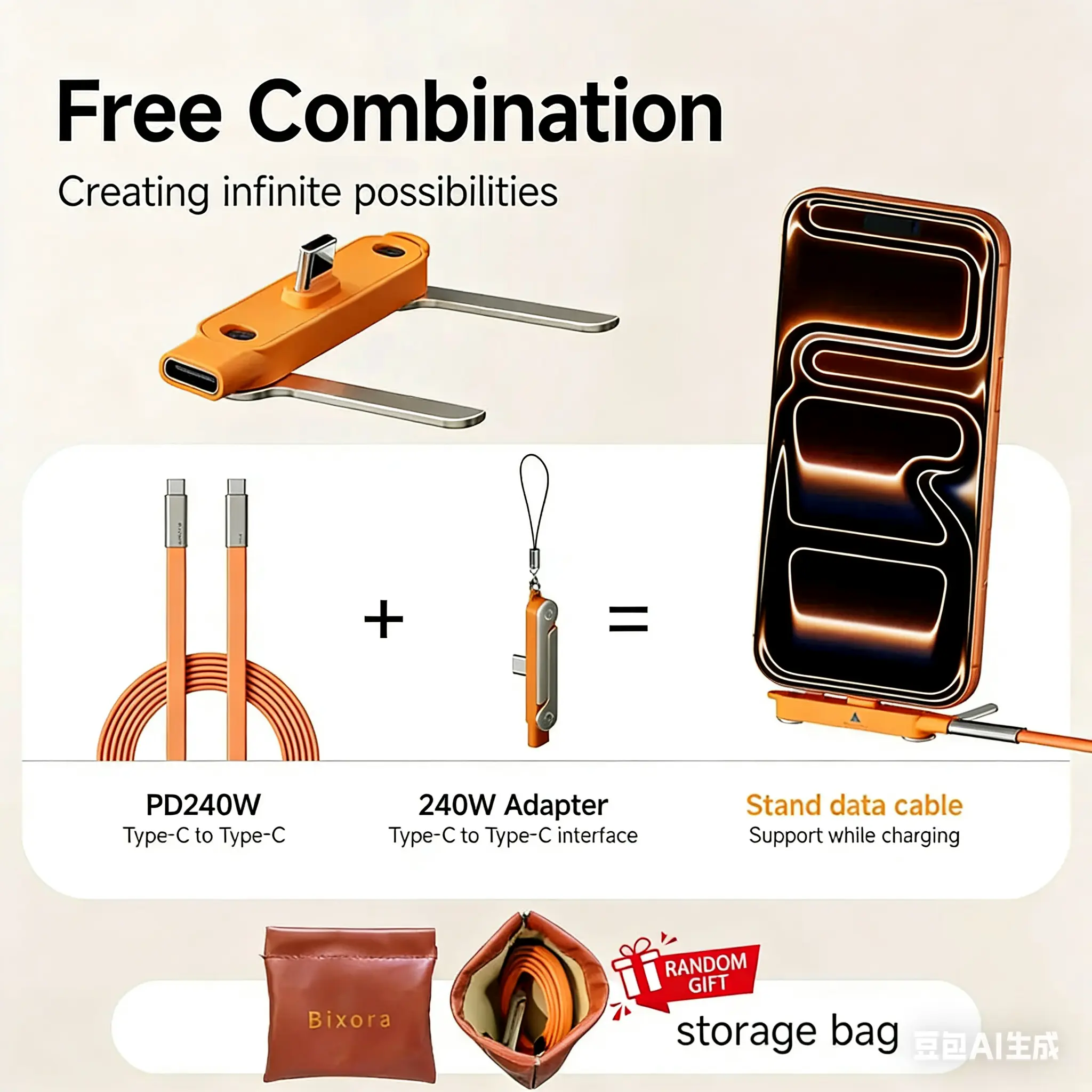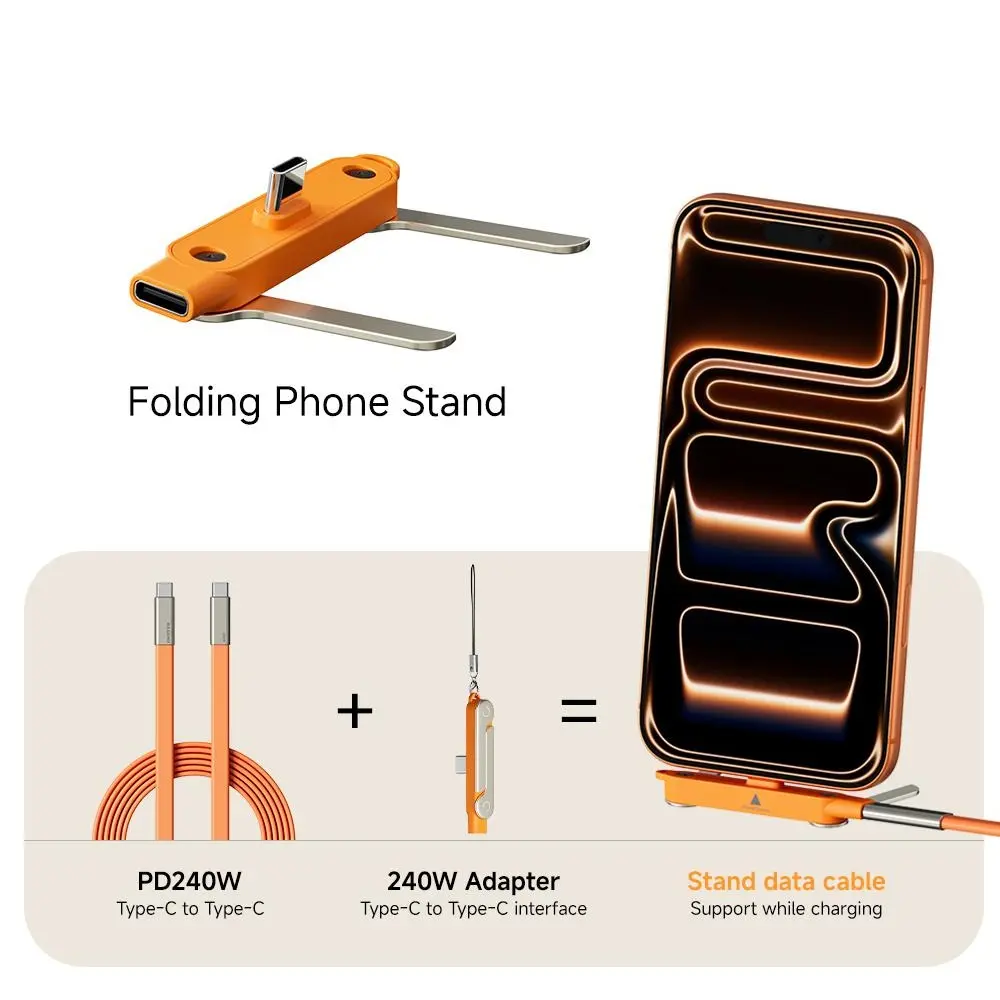 240W SuperCharge 360° Rotating Invisible Stand Detachable 2-in-1 Charging Cable, Zinc Alloy Silicone Type-C Cable, Compatible with Apple and Samsung, Essential for Gaming, Office and Car Use
