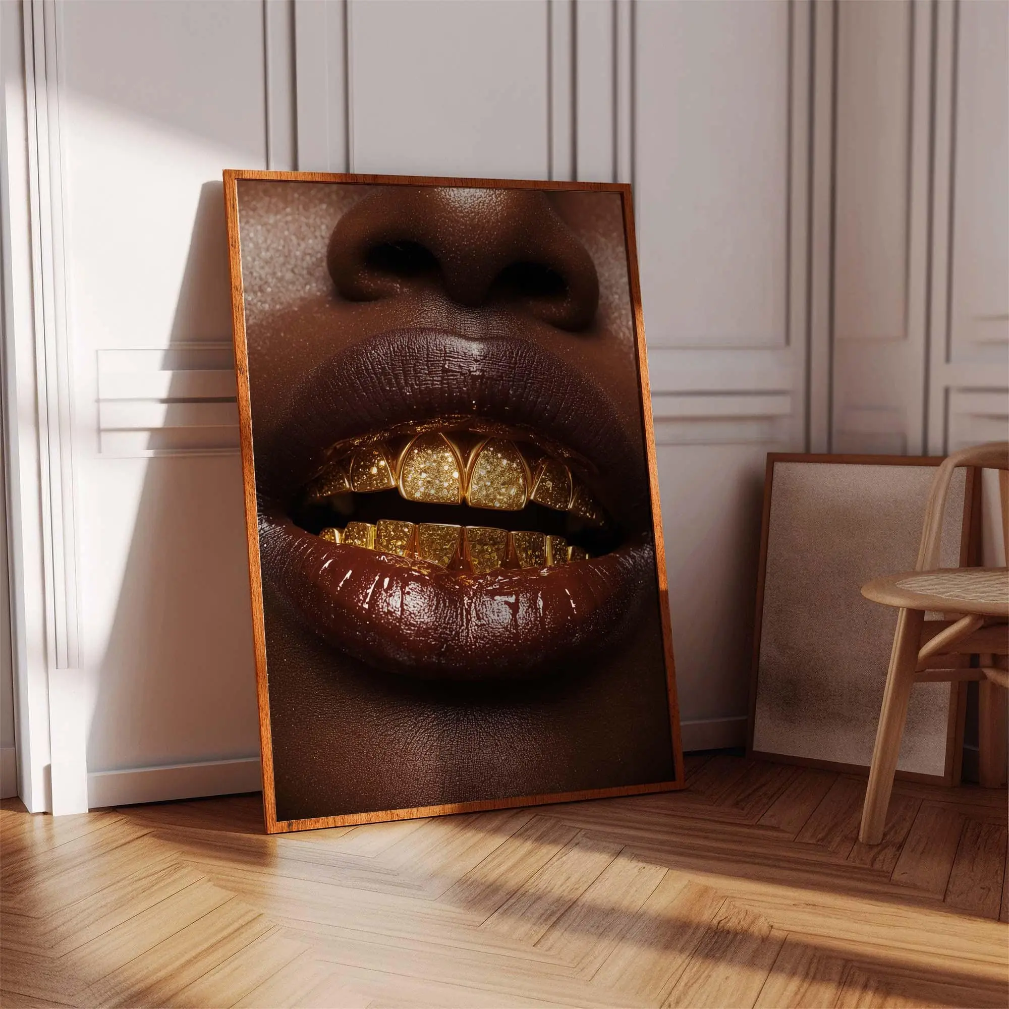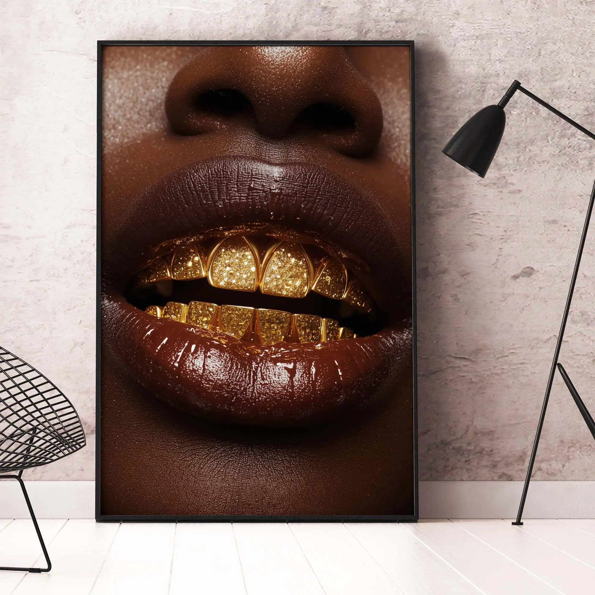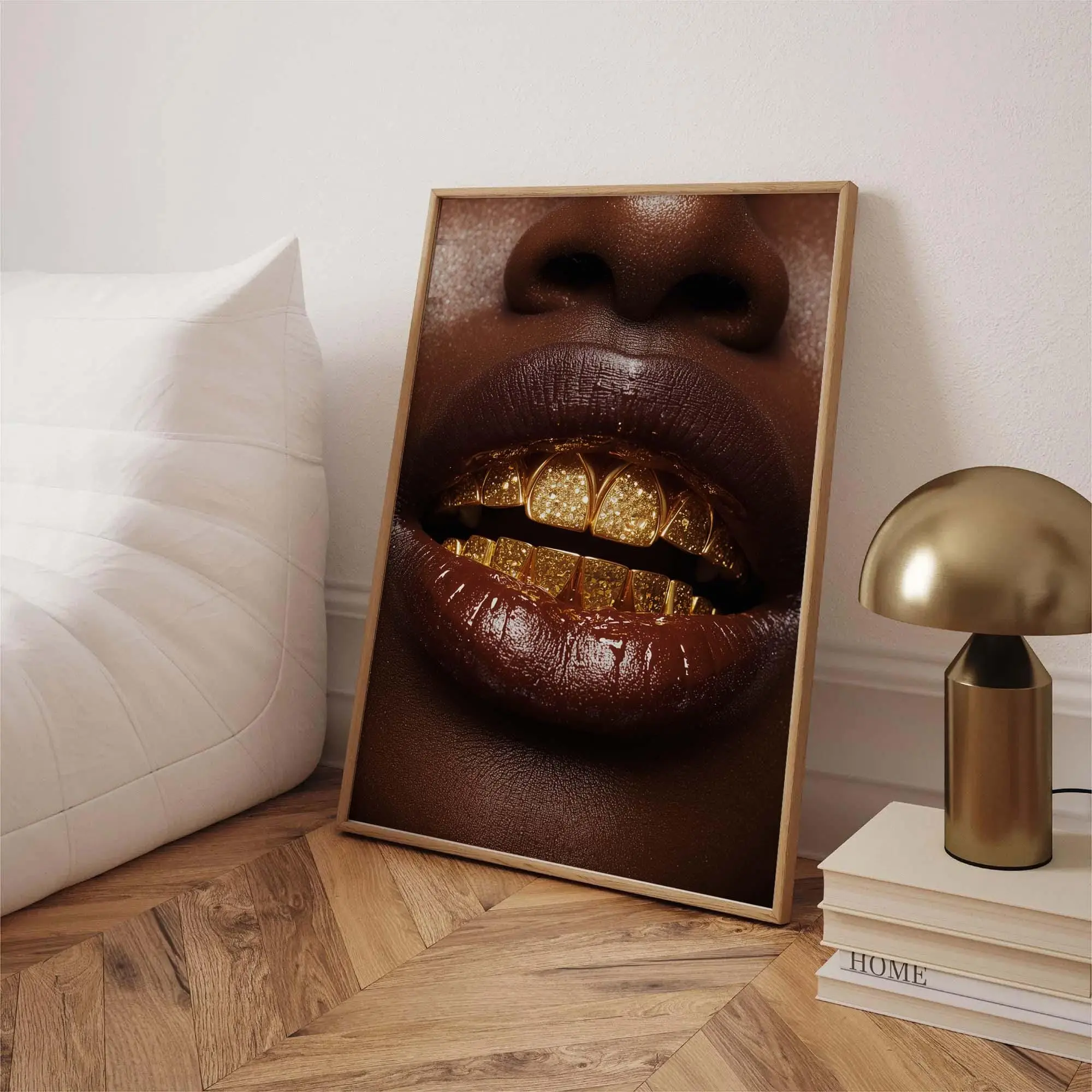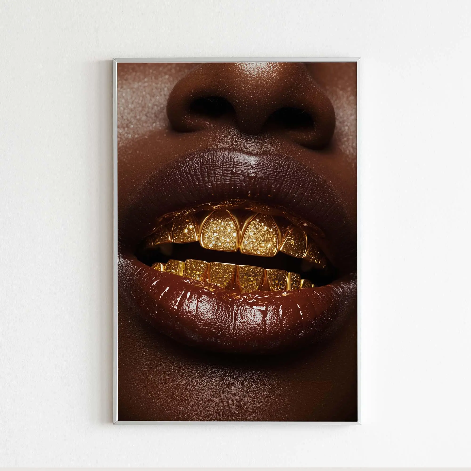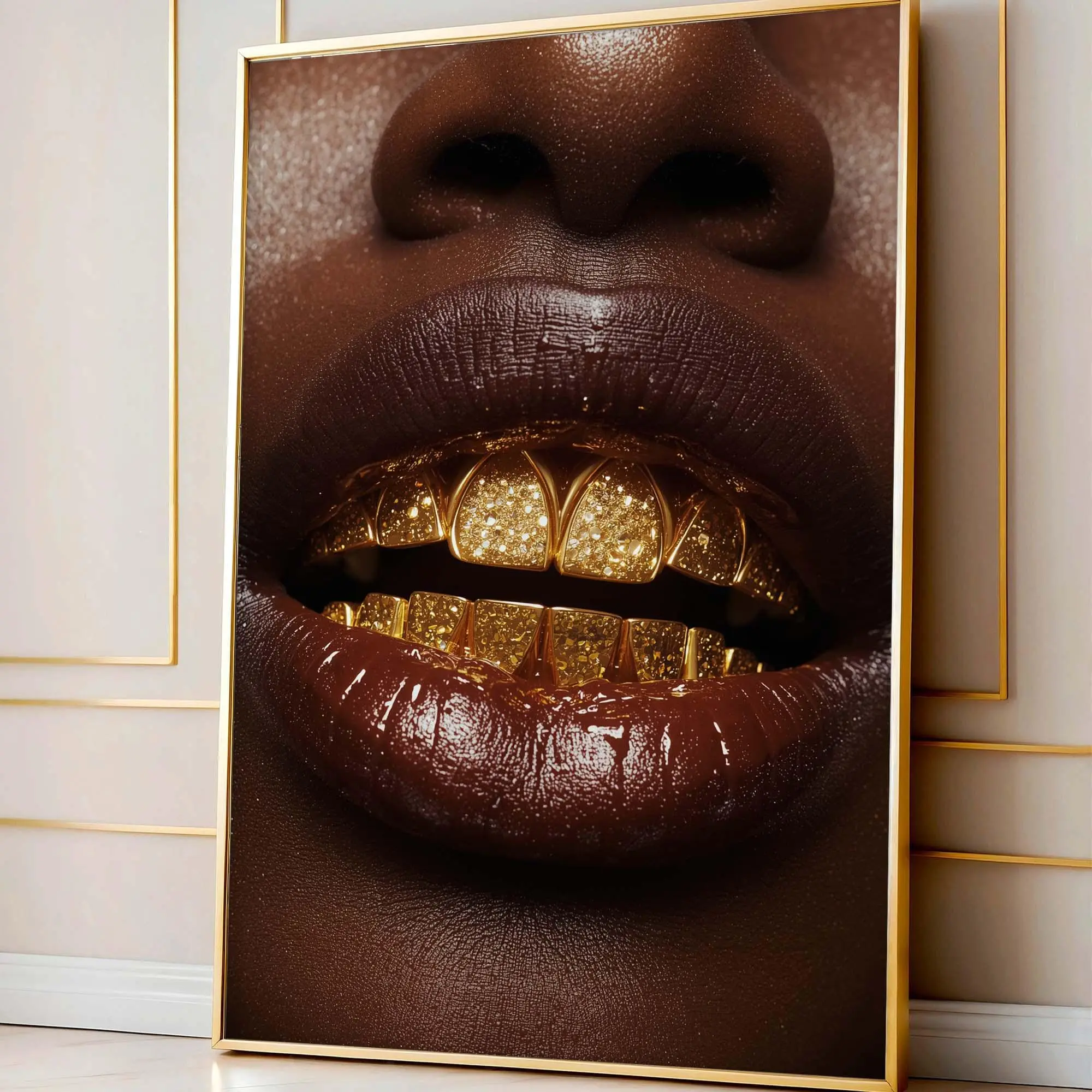 Luxury Gold Grills Lips Wall Art, Bold Modern Fashion Poster, Glamorous Aesthetic Print, Stylish Statement Decor For Bedroom Or Studio